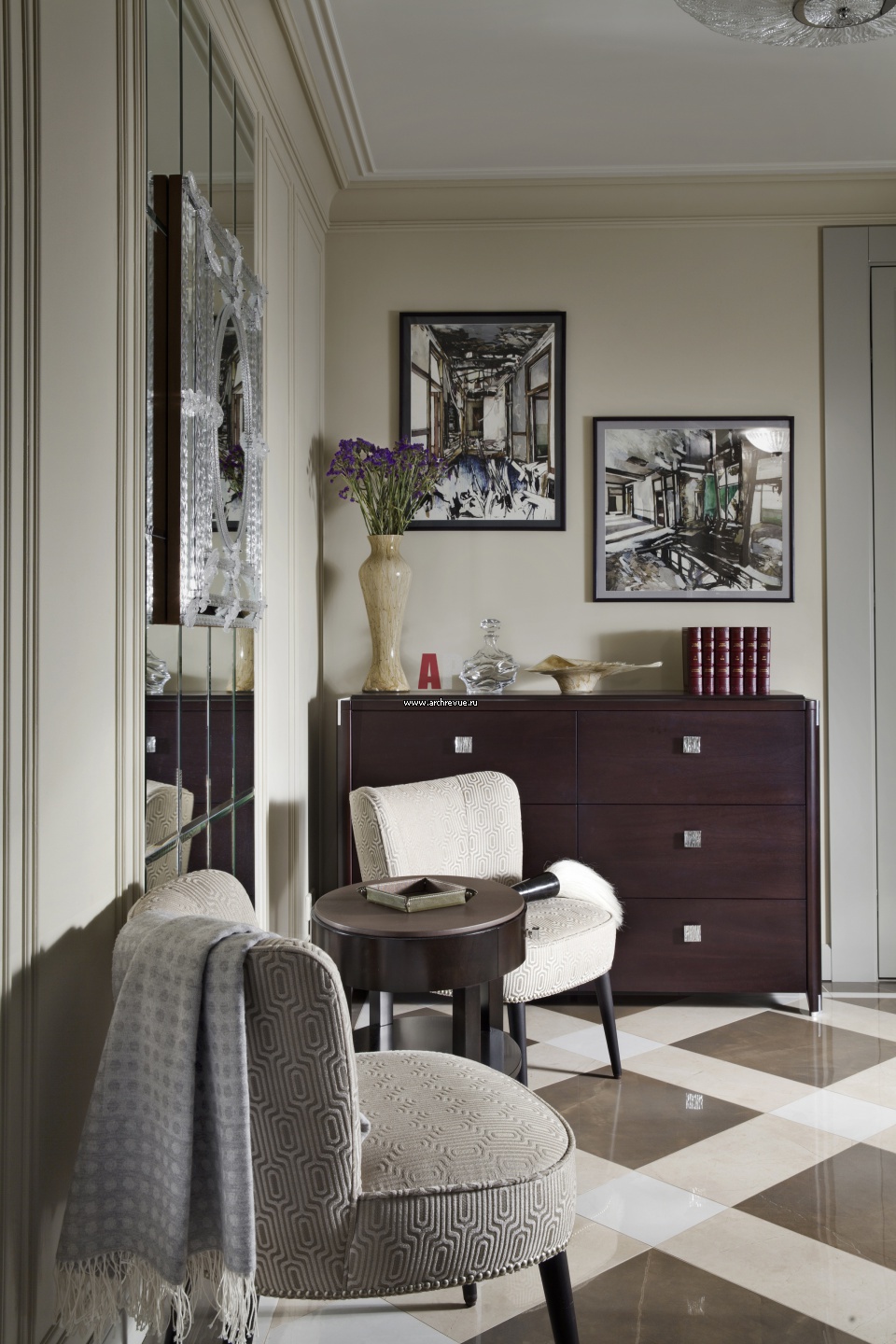 Интерьер входной зоны. На полу – раскладка в виде квадратов из полированного камня трех оттенков. На зеркальной стене размещено ажурное венецианское зеркало от Arte Veneziana. Кресла, Galimberti Nino. Все – поставщик «Москва-Рим».