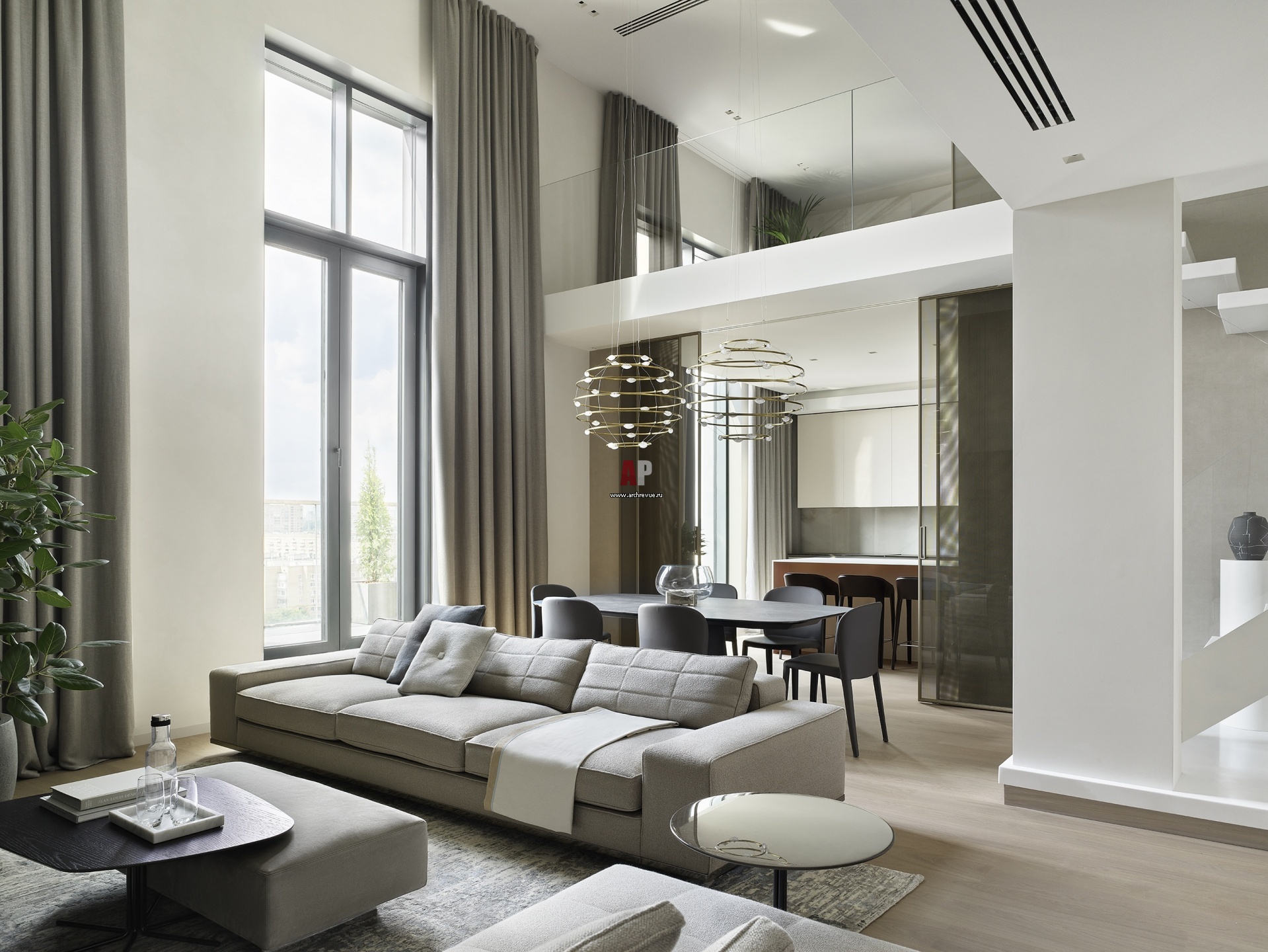 Двухэтажная гостиная. Диван, Minotti, модель Lawrence. Журнальные столики, Minotti, модель Rays. Портьеры на подкладке из ткани Christian Fischbacher. Встроенные светильники, iGuzzini.
