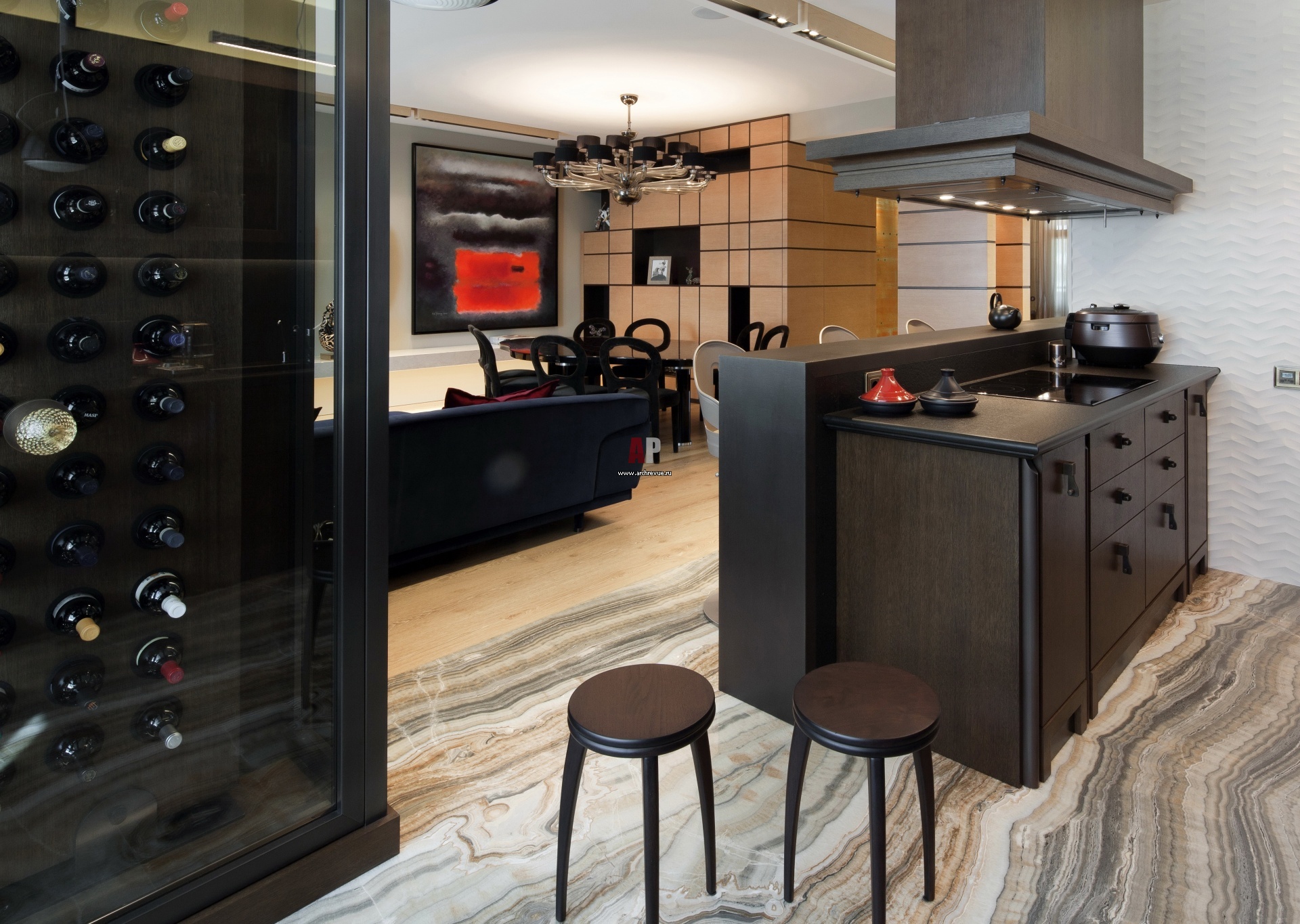 Фото интерьера общей зоны современной квартиры с произведениями искусства.