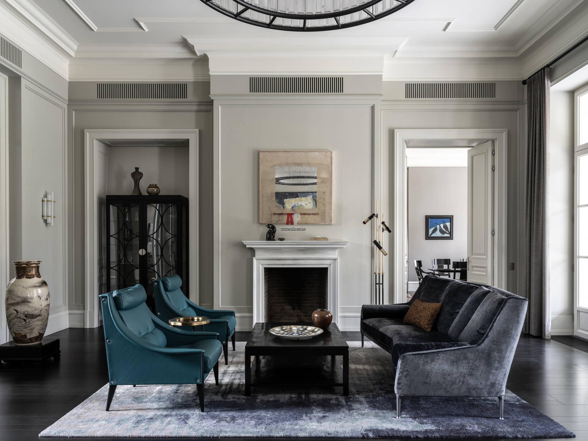 Каминная зона в гостиной Люстра диаметром 1,5 метра, Santa & Cole, модель Estadio. Диван, B&B Italia. Большой журнальный стол, JNL. Кресла, Poltrona Frau. Стол между креслами, Arteriors. Витрина, Hickory White. Торшер, Delightfull. Напольная ваза, фаянс, роспись, Япония, конец XIX века, мастерские Сацума.