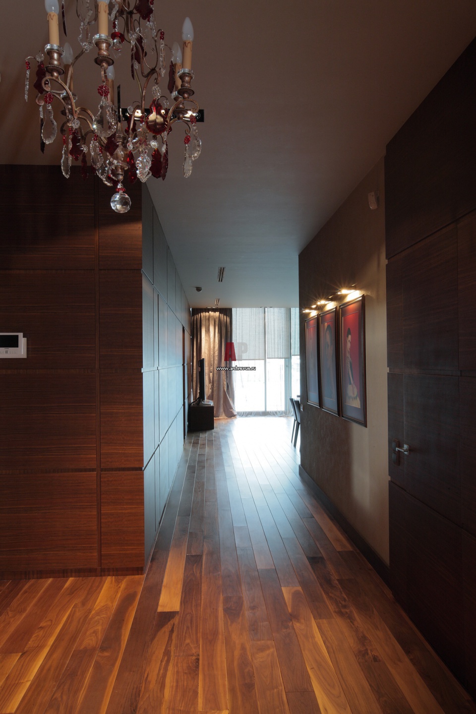 Вид из прихожей на гостиную. Половая доска с красивой фактурой из массива ореха, поставщик «Мир Паркета».