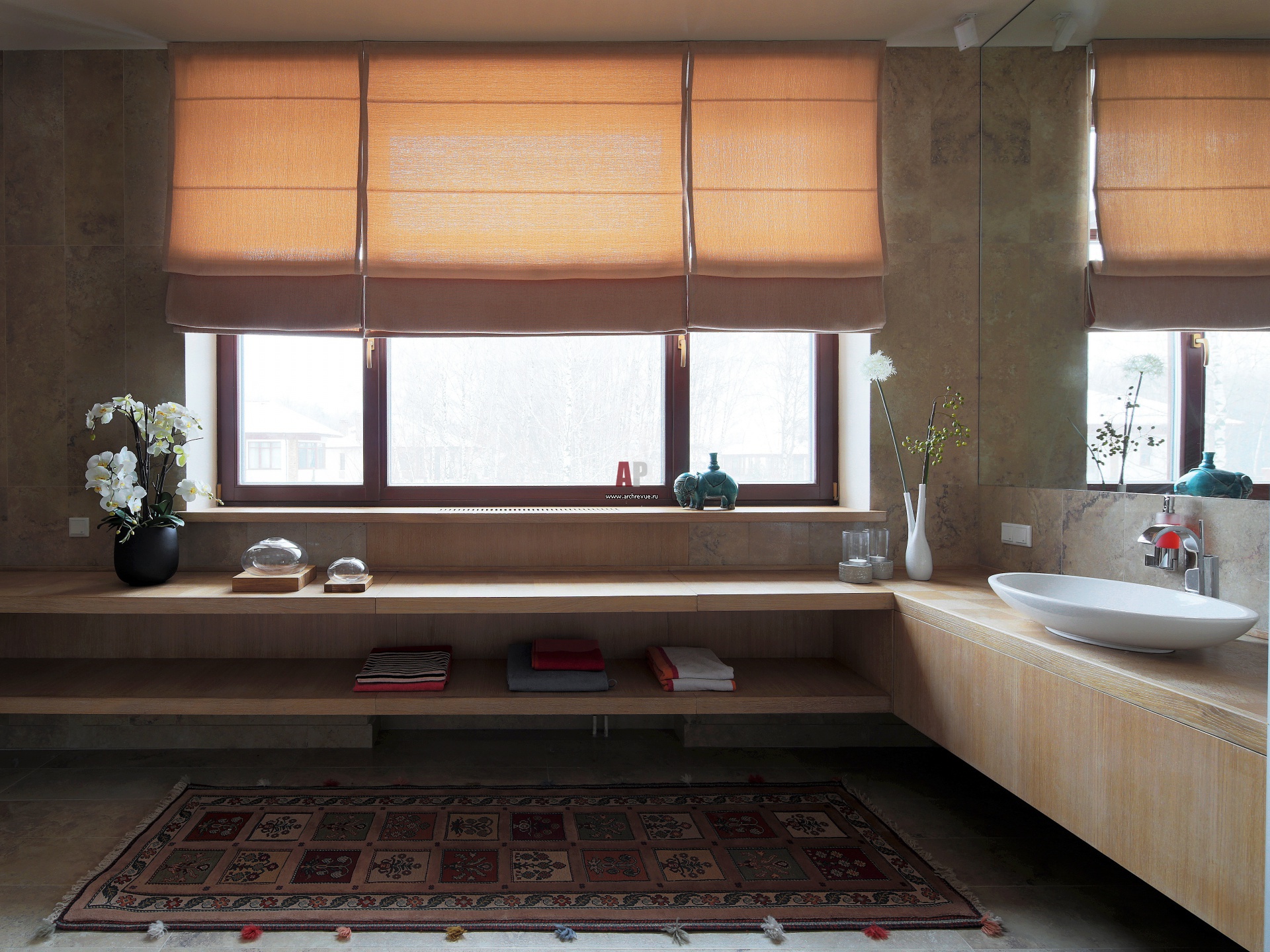 Фото интерьера ванной комнаты в гостевом доме. Стены отделаны керамогранитом «под травертин». Вдоль окна выстроена столешница, которая переходит в группу умывальника. Санфаянс, Villeroy & Boch.