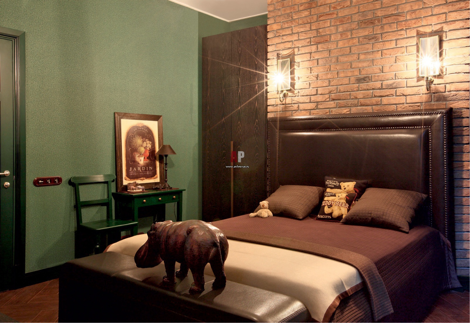 Часть стены в детской мальчика оклеена зелеными обоями Sanderson с мелким флористическим рисунком, поставщик ROSBRI. Кровать Baxter.