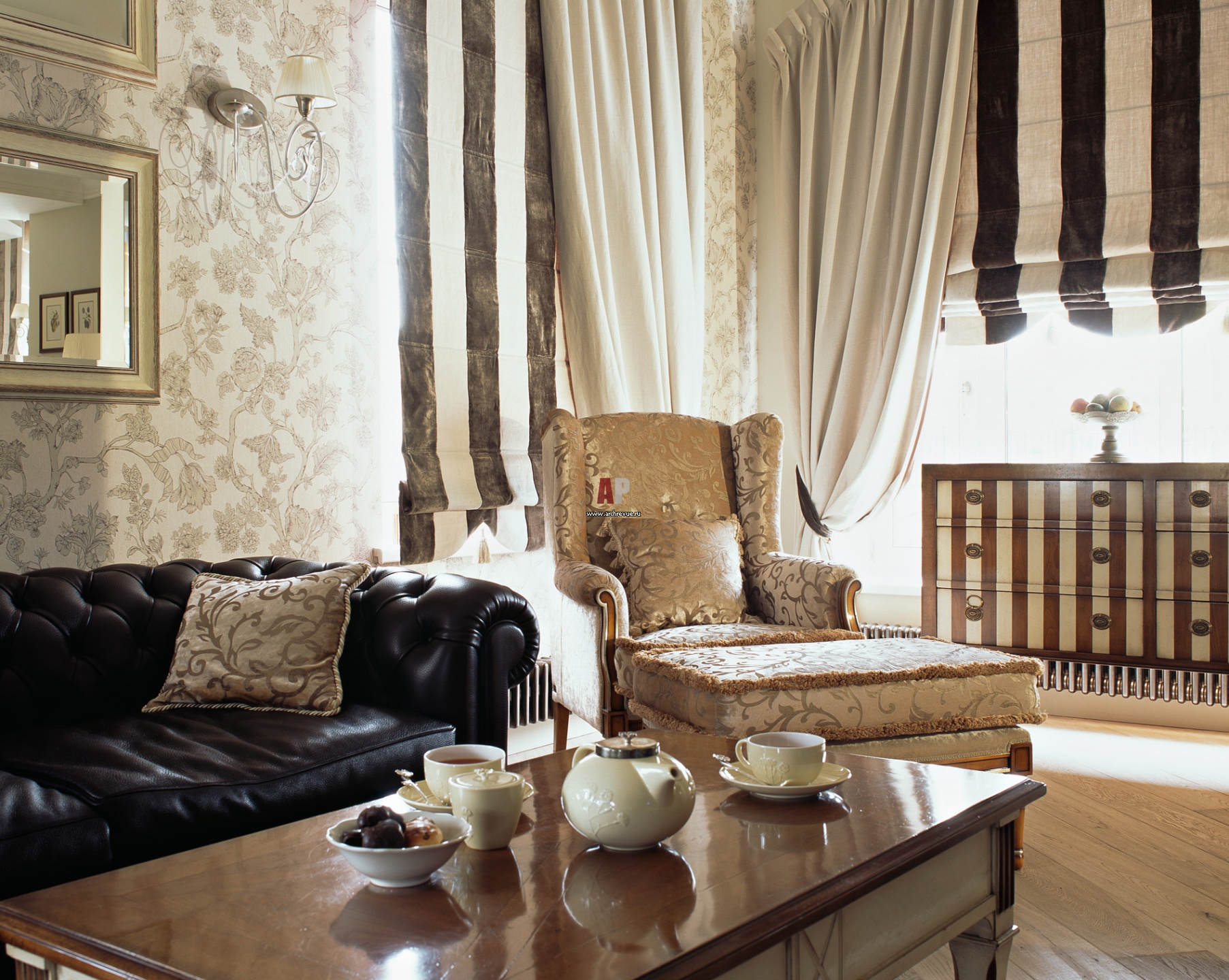 Зона отдыха в гостиной. Шторы для гостиной и кабинета шились из полос льна и бархата по эскизам авторов проекта.