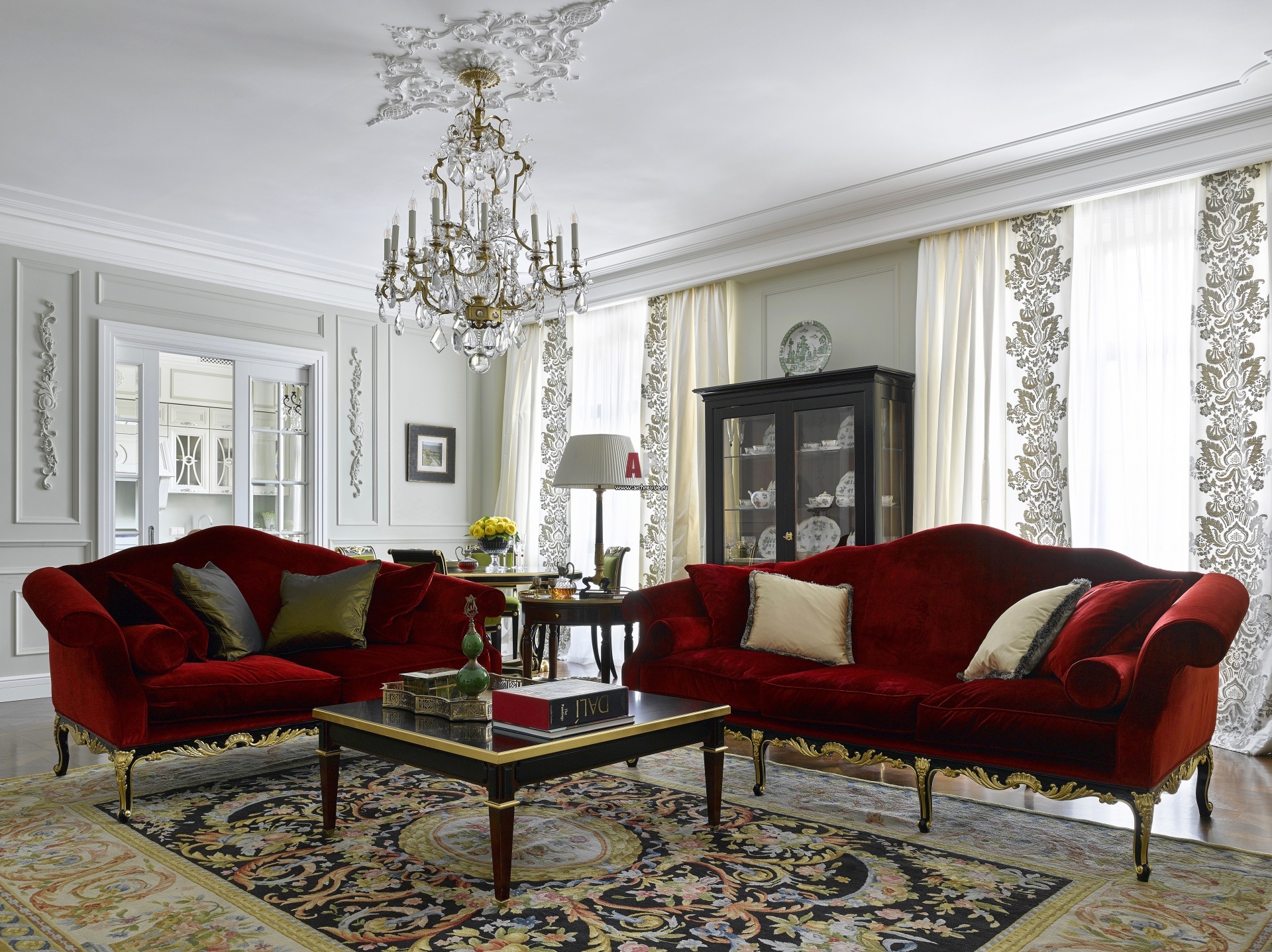 Интерьер гостиной в итальянском стиле. Красные бархатные диваны, Oak. Аксессуары, Charles.Cameron. Шторы, Nobilis. Вторые шторы, James Hare. Тюль, Sahco.