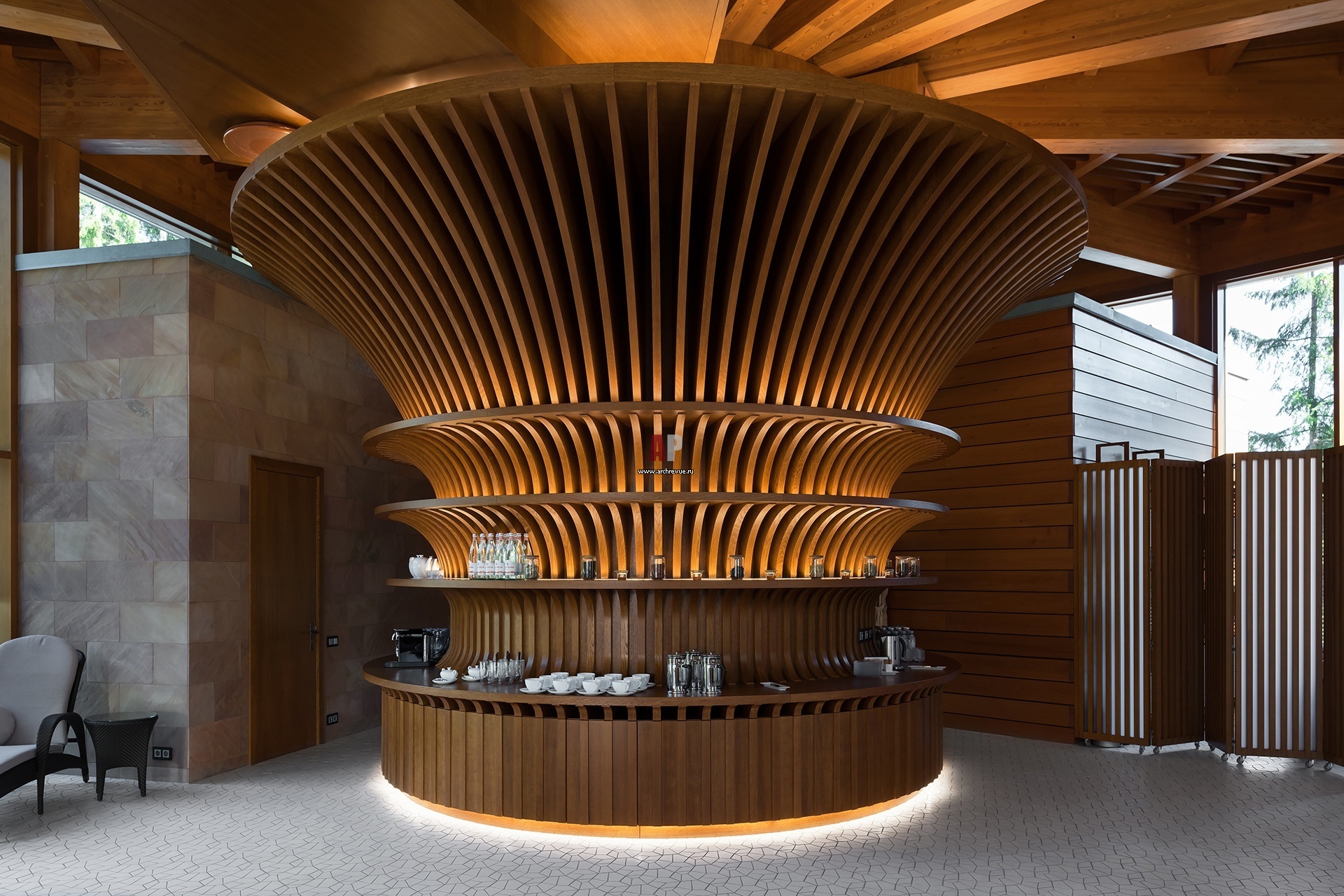 Усадьба Клаугис в Латвии. СПА-комплекс. Интерьер зоны отдыха. Круглый бар выполнен из дерева.