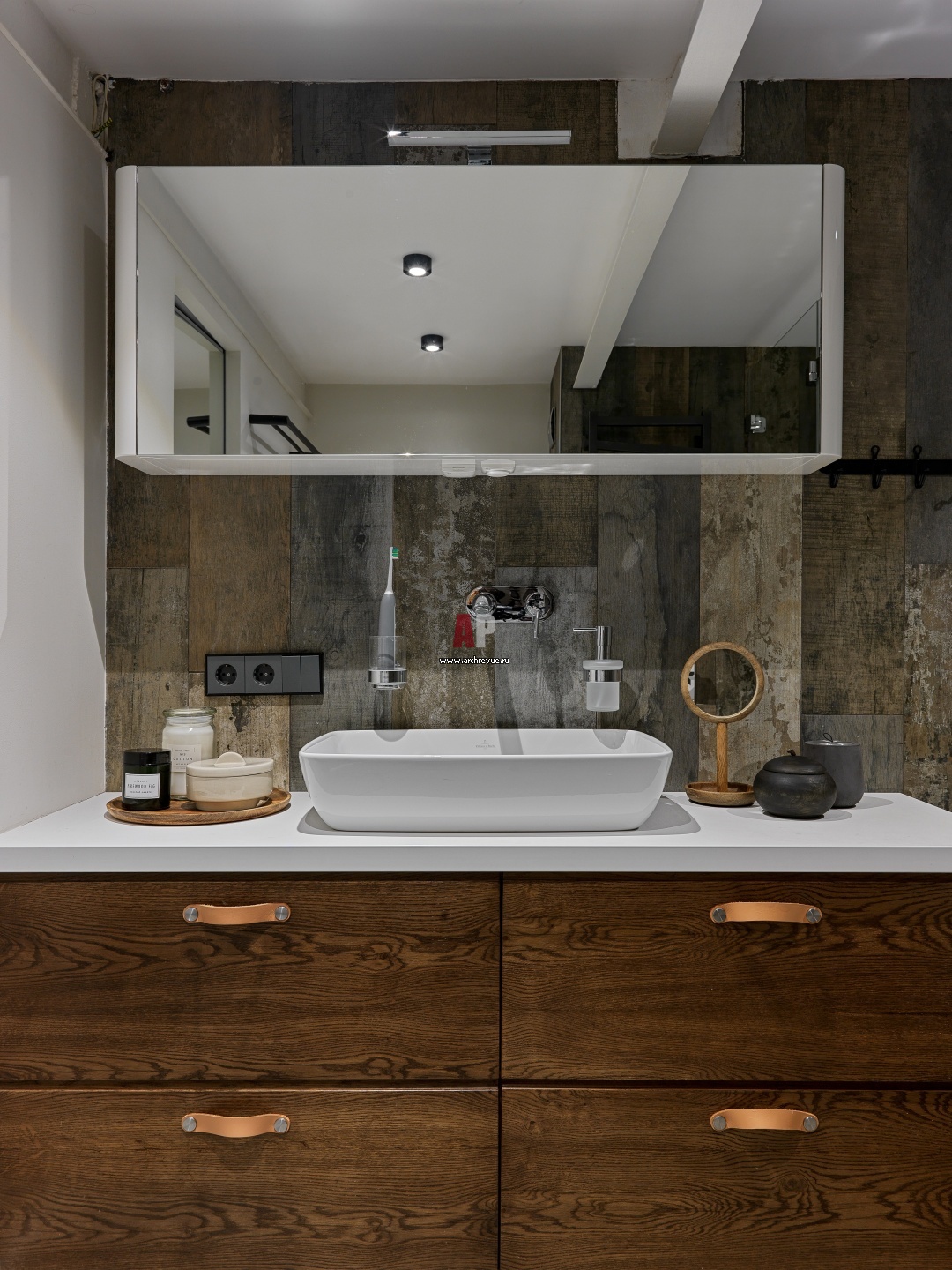 Стены в санузле облицованы плиткой под состаренное, амбарное дерево. Тумба под раковину из дерева с ярко выраженной текстурой изготовлена на заказ. Раковина, Villeroy & Boch. Смесители, Hansgrohe.