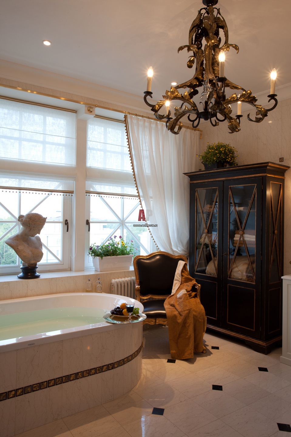 Хозяйская ванная комната решена в стилистке ампира. Люстра Mis en Demeure. Сантехника Villeroy & Boch.