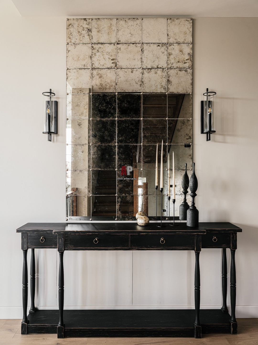 Холл. В патинированном зеркале над консолью отражается лестница.
