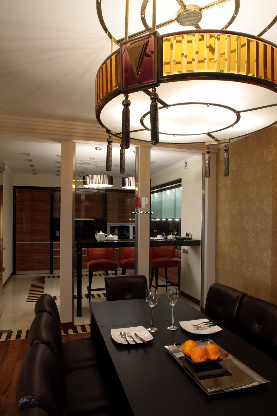 Вид со стороны столовой на кухню. Разные по назначению зоны разделяет раздвижная стеклянная перегородка, встроенная между тремя декоративными колоннами из гипса.