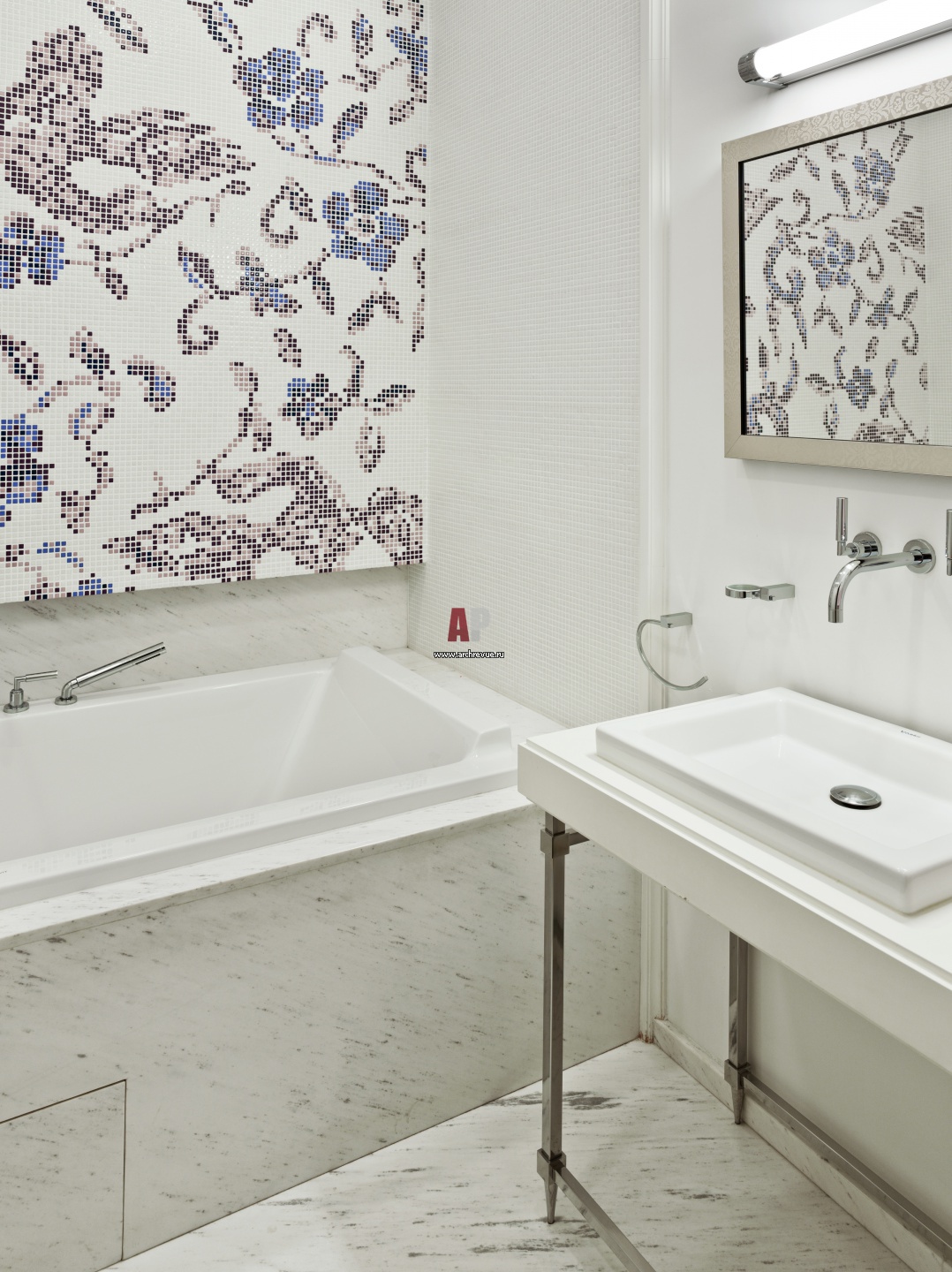 Интерьер ванной комнаты. Пол, фасад ванны облицованы белым с серыми прожилками мрамором. Мозаичное панно исполнено в разбеленной цветовой гамме и напоминает старинную вещь. Сантехника, Duravit.