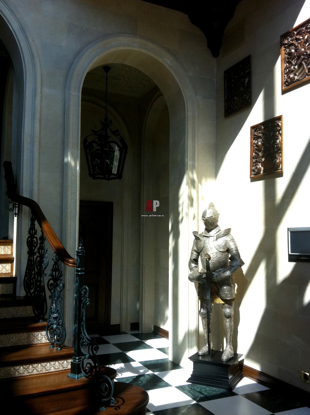 Лестницу в замке «охраняет» рыцарь в железных доспехах.