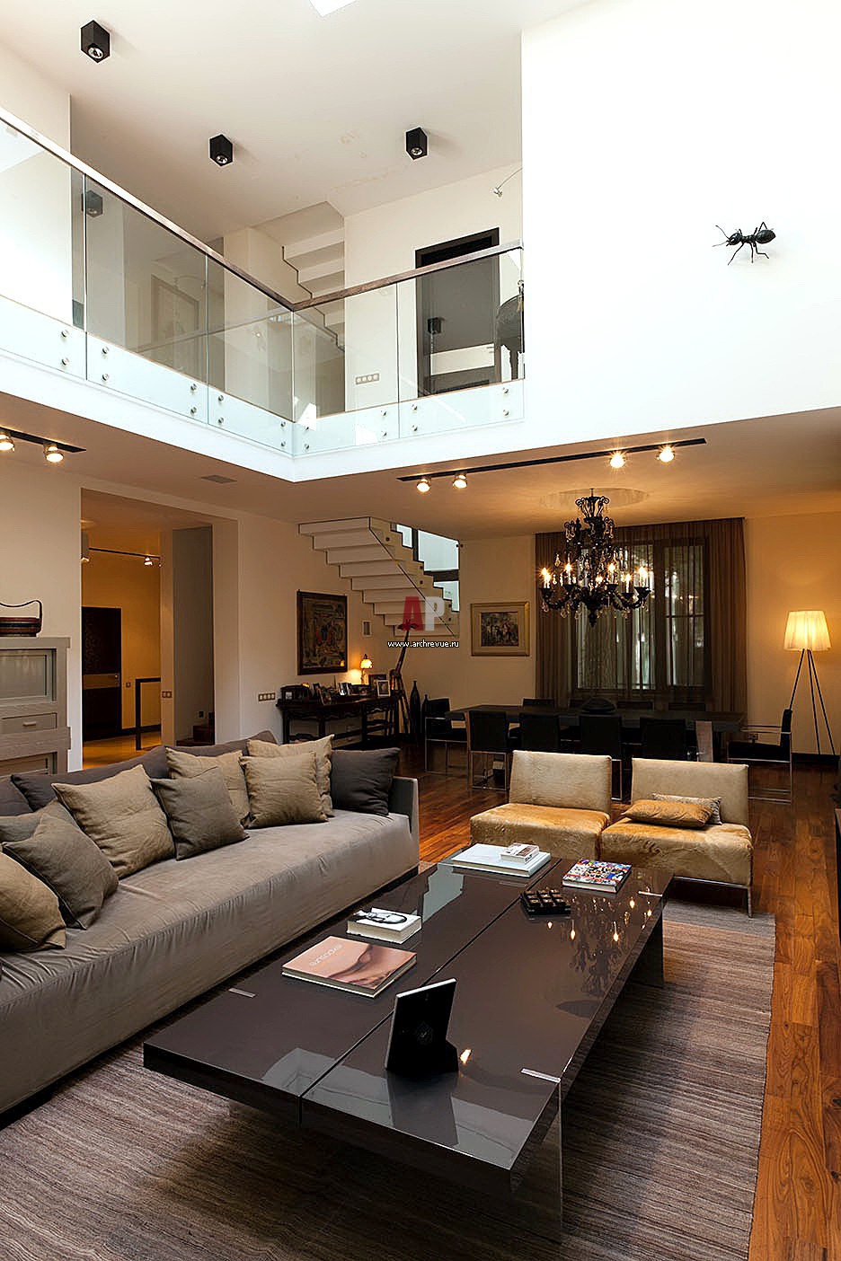 На фоне монохромных белых стен контрастно смотрятся декоративные элементы и предметы природных тонов: коричневого, песочного, сливового, цвета мокрого асфальта. На полу – килим ручной работы. Мебель Baltus Collection, Desiree, Poltrona Frau, Fiam, Tisettanta, поставщик R-Studio.