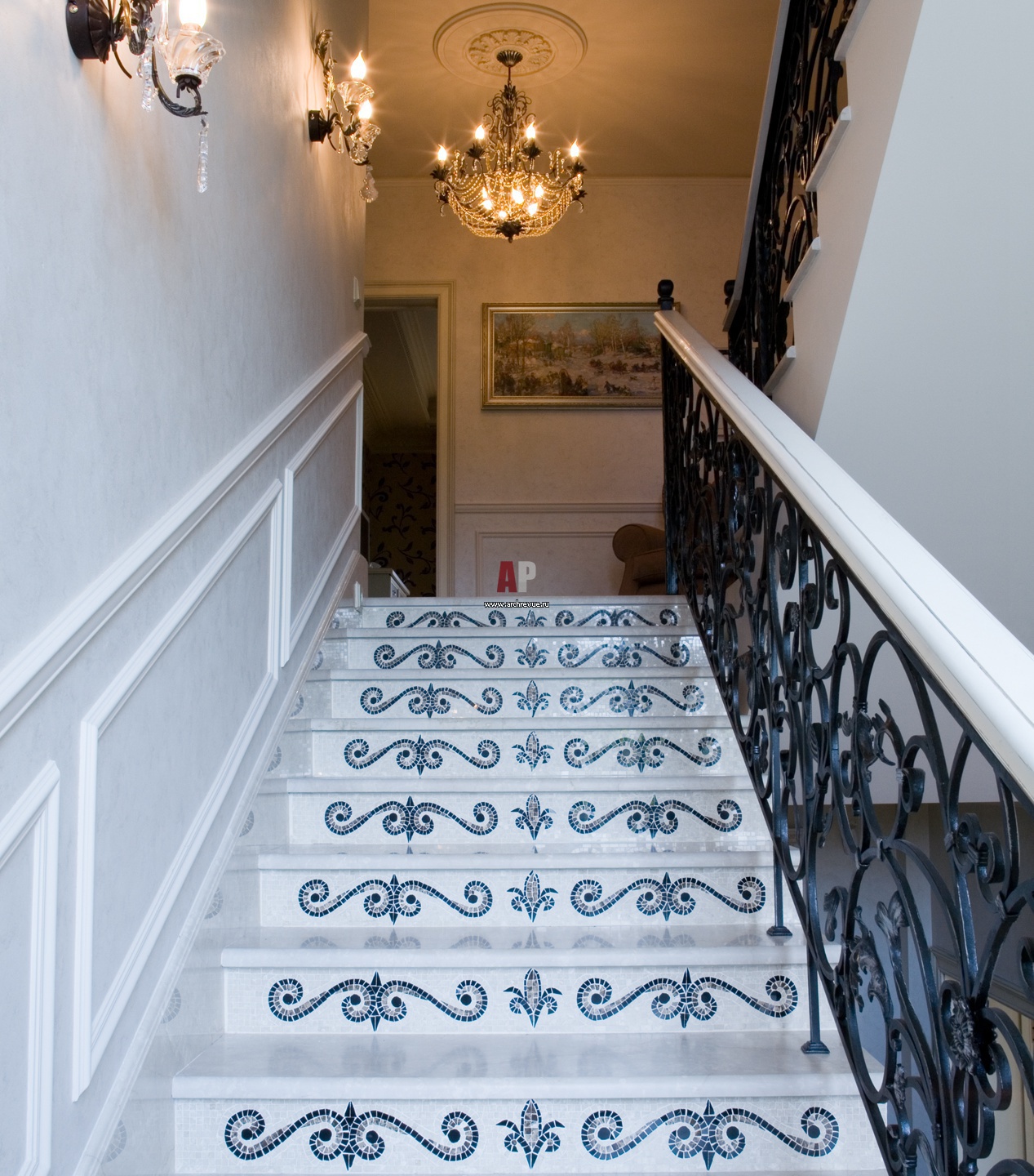 Центральный элемент декора дома – черно-белая глянцевая мозаика. Она создана по эскизам авторов проекта мастерами компании «АРДО».