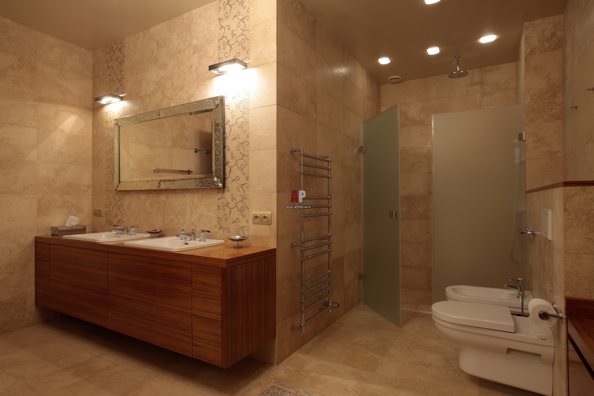 Душевая в хозяйском санузле. Перегородки из матового стекла выполнены строительным способом.
