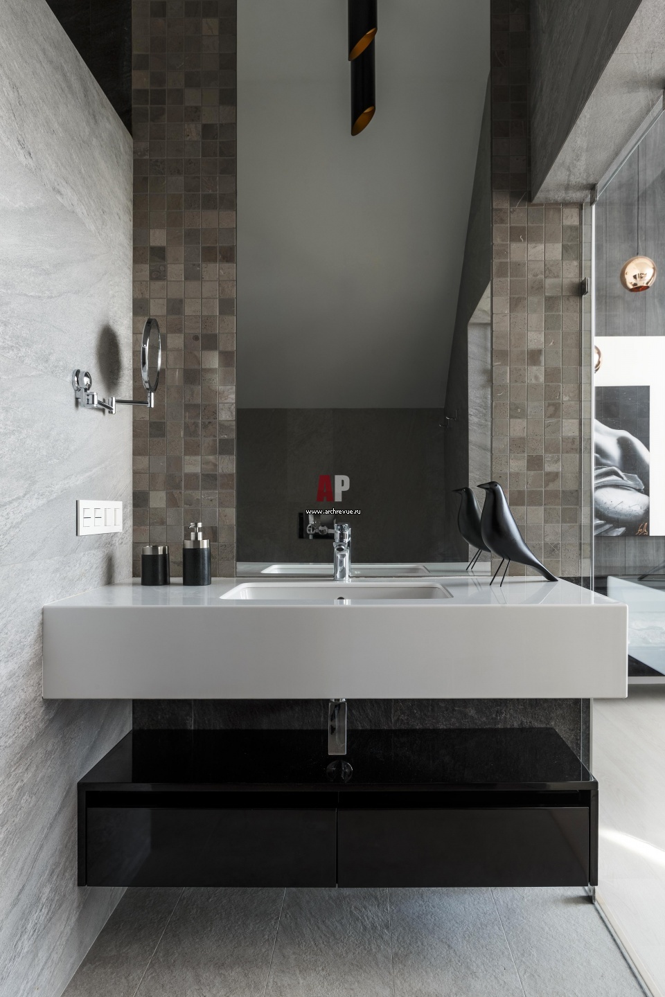 Санузел с душевой при хозяйской спальне. Стены облицованы серым керамогранитом под мрамор и каменной мозаикой.