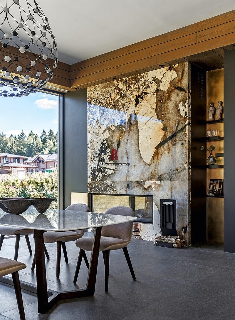 Современный двухэтажный дом с природными текстурами и панорамными окнами. Фасад камина отделан кварцитом сорта «Патагония» и латунными пластинами.