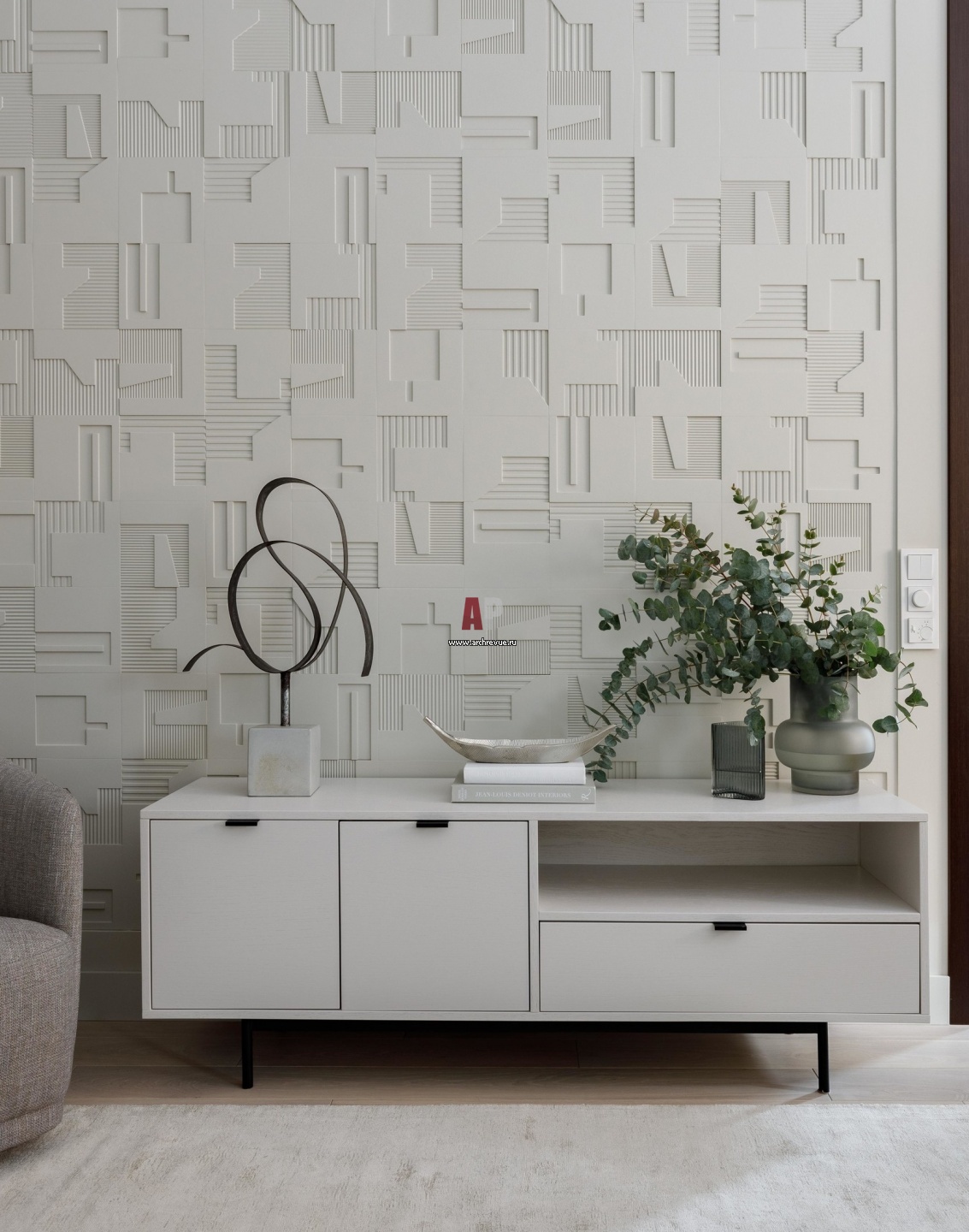 Акцент гостиной – настенное гипсовое панно. Его рисунок сложен из 6 модулей с разной геометрией. Панно выполнено на производстве в Пскове.