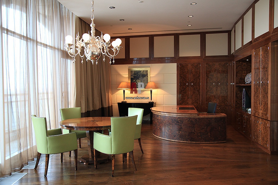 Материалы отделки кабинета подбирались к полукруглому рабочему столу, выполненному на заказ мастерами компании «Коммодиум» из массива ореха и корня ореха. Встроенная мебель сделана по эскизам авторов проекта на фабрике RBS (Англия). Стены зашиты панелями из натуральной кожи.
