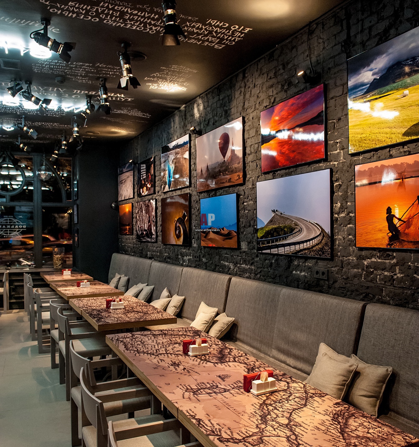 Фото интерьера современного молодежного бара. На стенах – фотографии, выполненные владельцем заведения – блогером-путешественником Сергеем Долей.