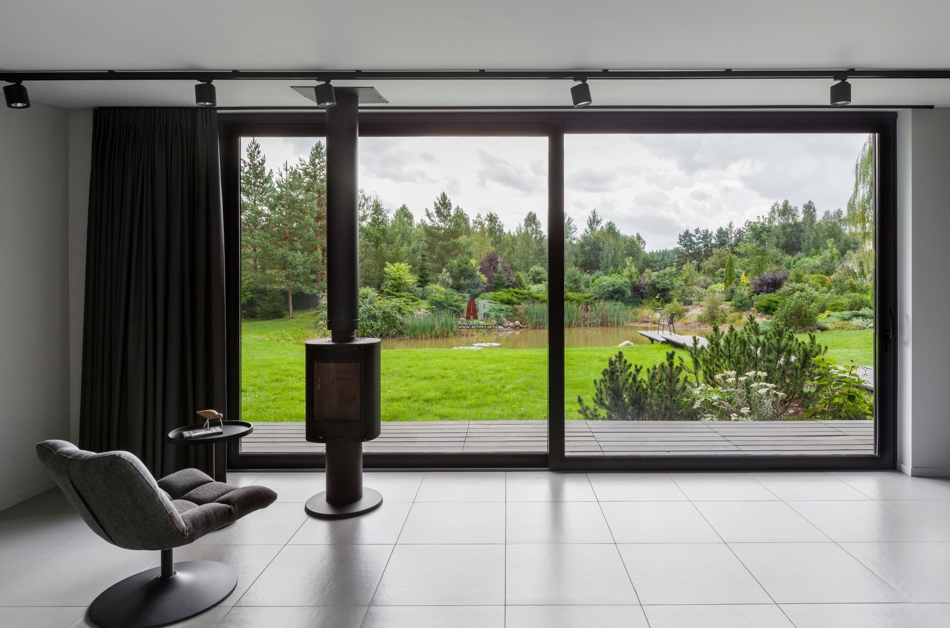В жилой части сделан большой раздвижной витраж длиной 5,5 метров. Напротив панорамного окна – дровяной камин с черным стальным корпусом, Contura. Он подобран и размещен таким образом, чтобы не заслонял пейзаж, но давал фронтальную проекцию огня. Кресло, Zuiver.