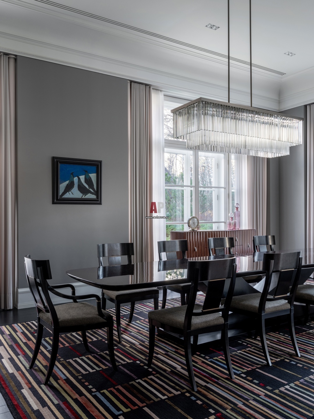 Столовая. Стол длиною 4,5 метра пришлось делать на заказ – в стандартной линейке не удалось найти нужный размер. На полу – ковер, соткан по эскизу ковра 1960-х годов в Непале специально для проекта. Стол, Christopher Guy. Стулья и комод, Bolier. Люстра, Bella Figura. Шторы, Evitavonni. Картина «Вороны» Виктора Дынникова.