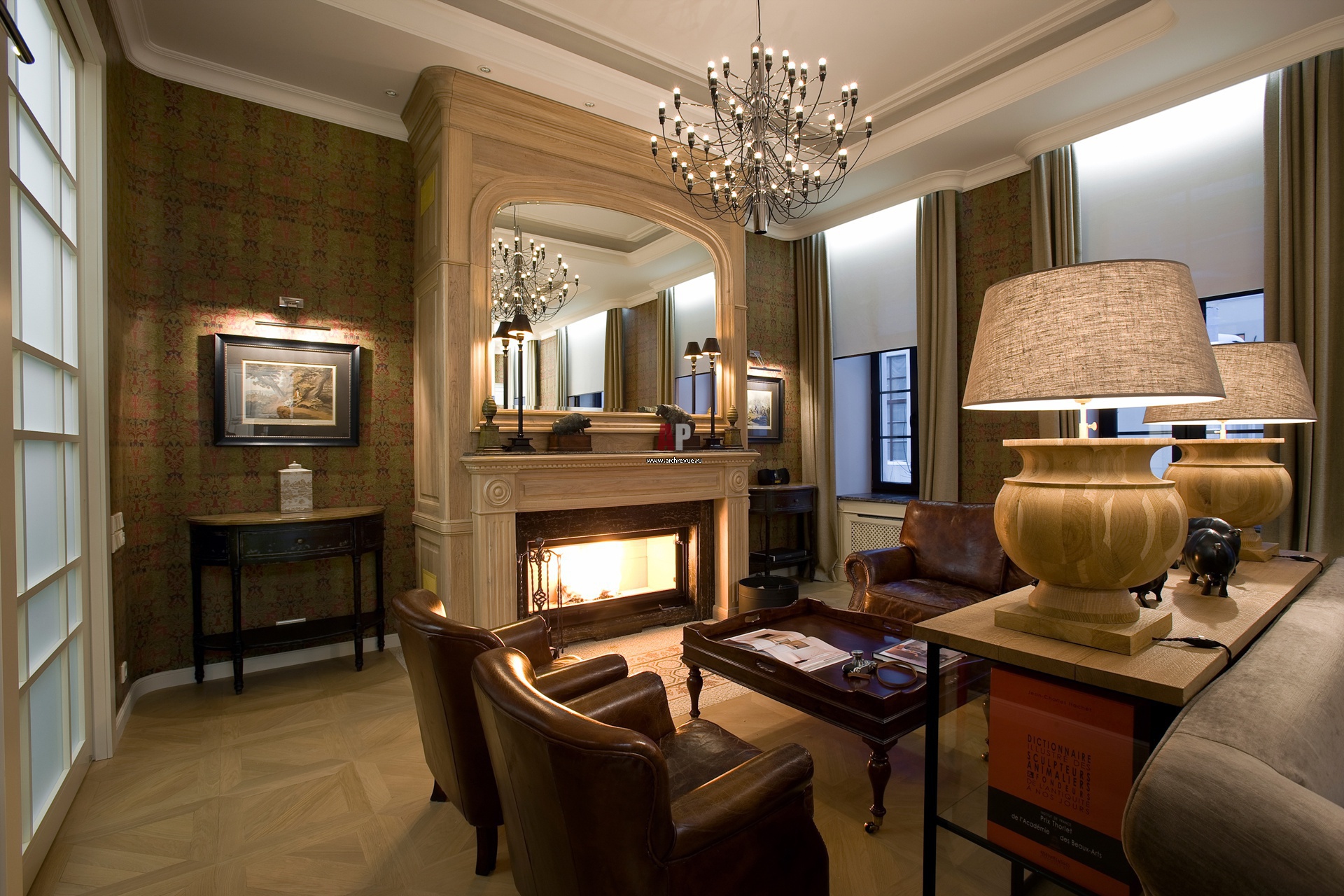 Камин – обязательный элемент интерьера в духе старой Москвы. Он создан на месте старинного дымохода. Каминный короб облицован панелями из дуба под лаком, сохраняющим природную структуру дерева. В центре – полукруглое зеркало, отсылающее к традициям ар-нуво.
