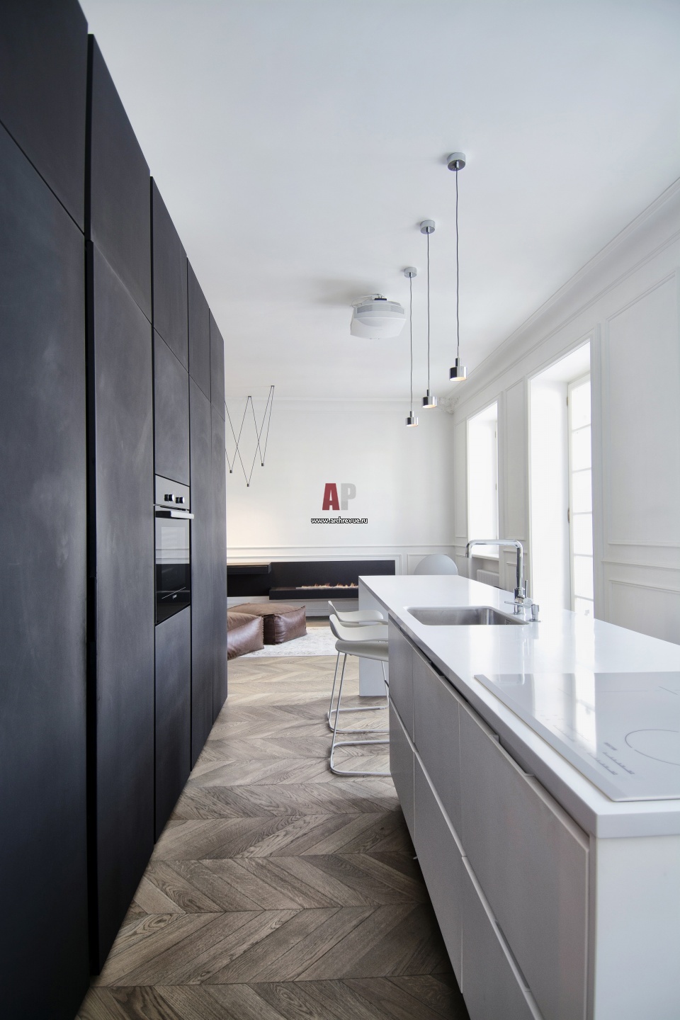 Перегородки бокса, как и кухонные шкафы с островом, выполнены на фабрике Giulia Novars. Фасады декорированы черной матовой эмалью soft touch.