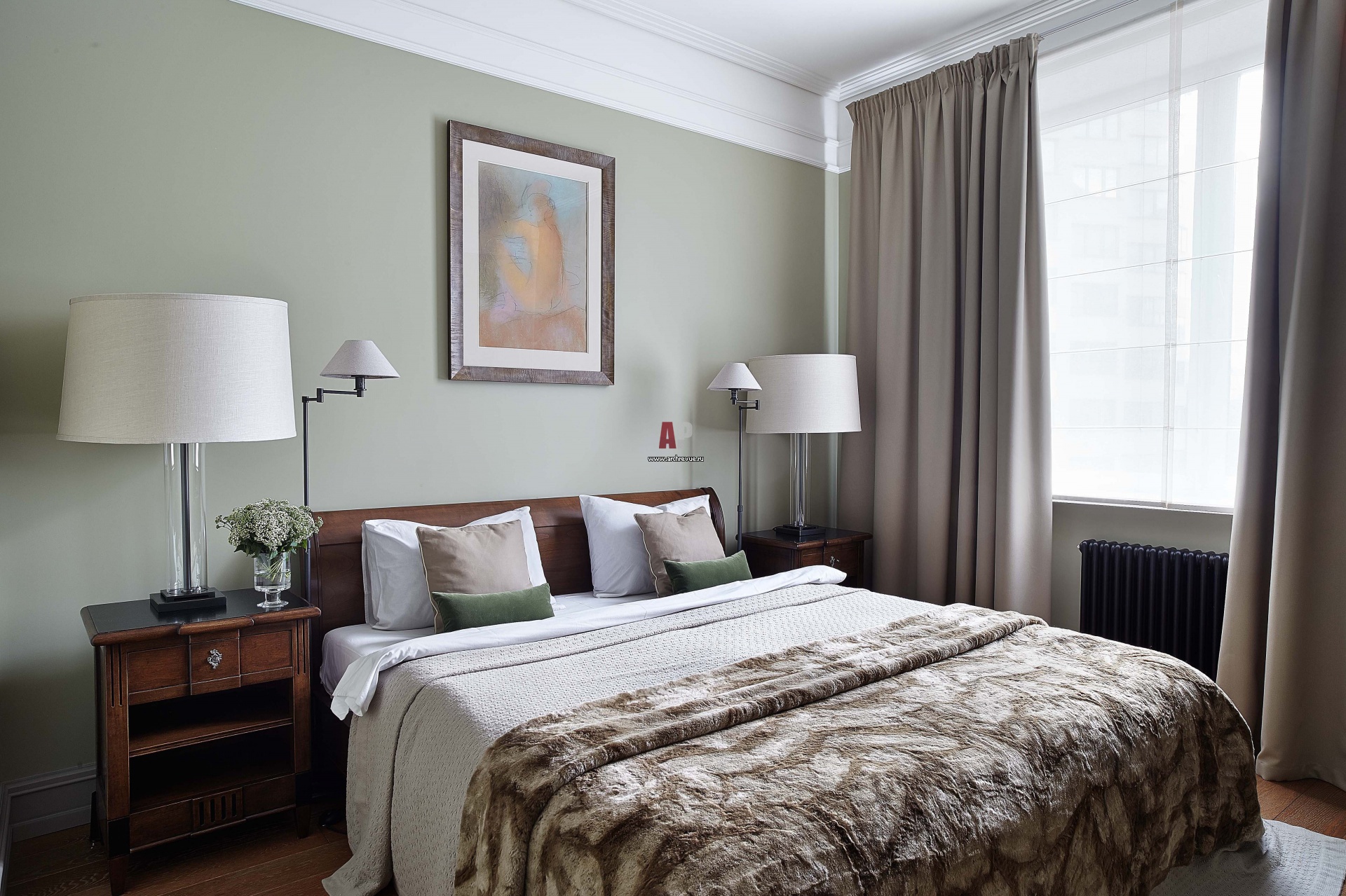 Стены спальни выкрашены в фисташковый цвет. Широкий потолочный карниз из гипса придает помещению нарядный вид. Мебель, Morelato, Luciano Zonta.