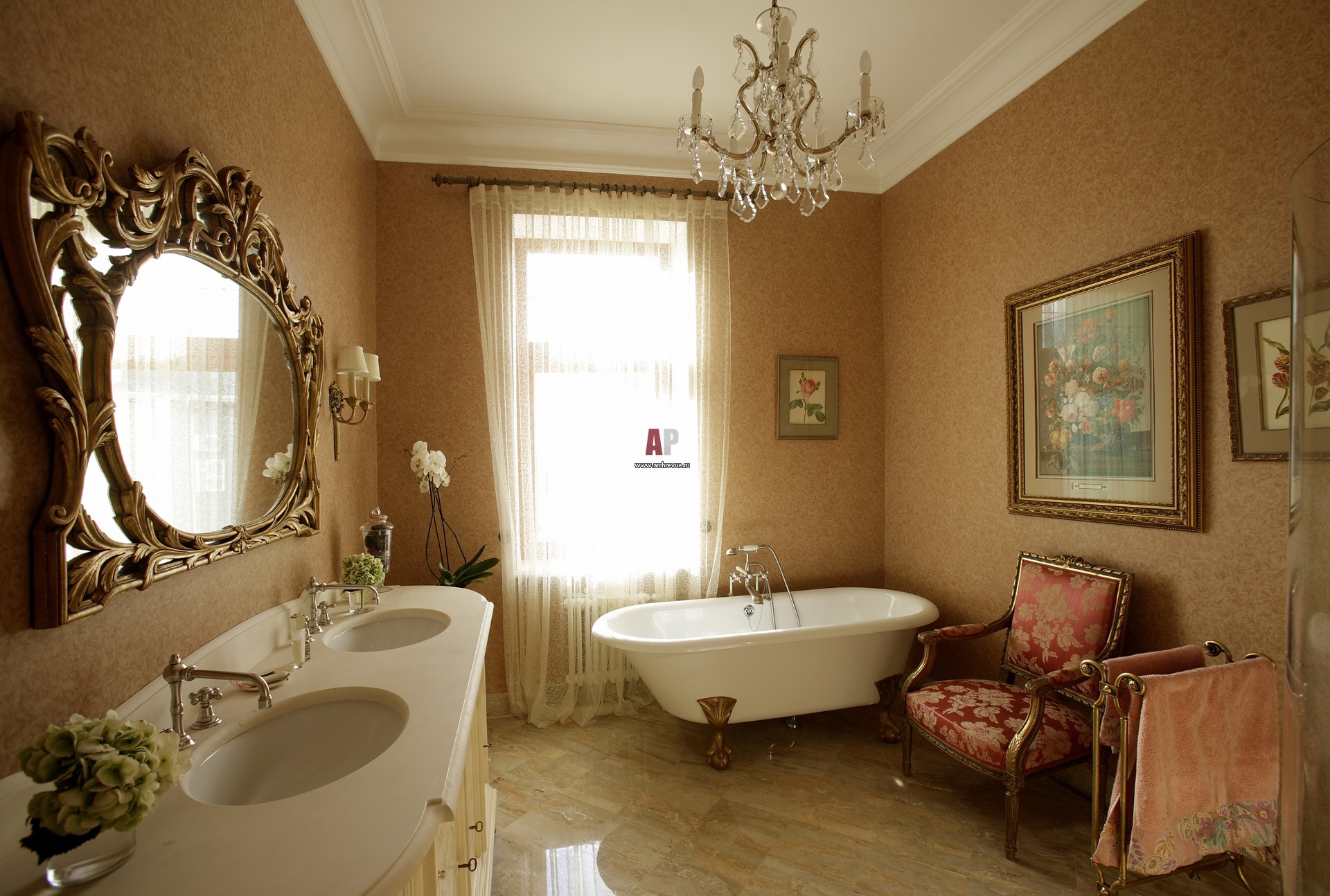 Интерьер хозяйской ванной комнаты оформлении как жилая комната. На стенах – обои, на полу – полированный мрамор. Ванна на золотых лапах, Villeroy & Boch.