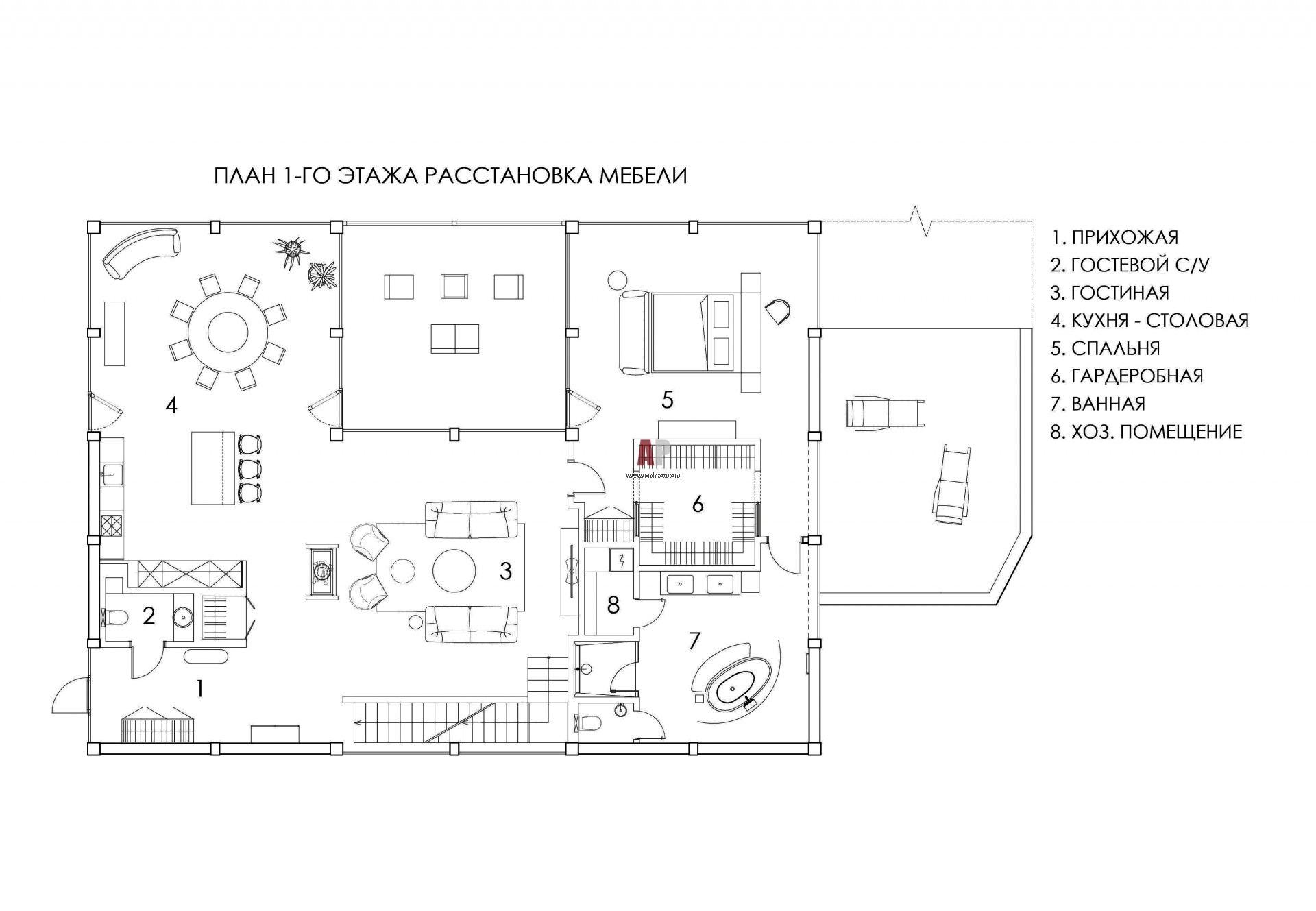 Планировка 1 этажа 3-х этажного дома в стиле современного фахверка.