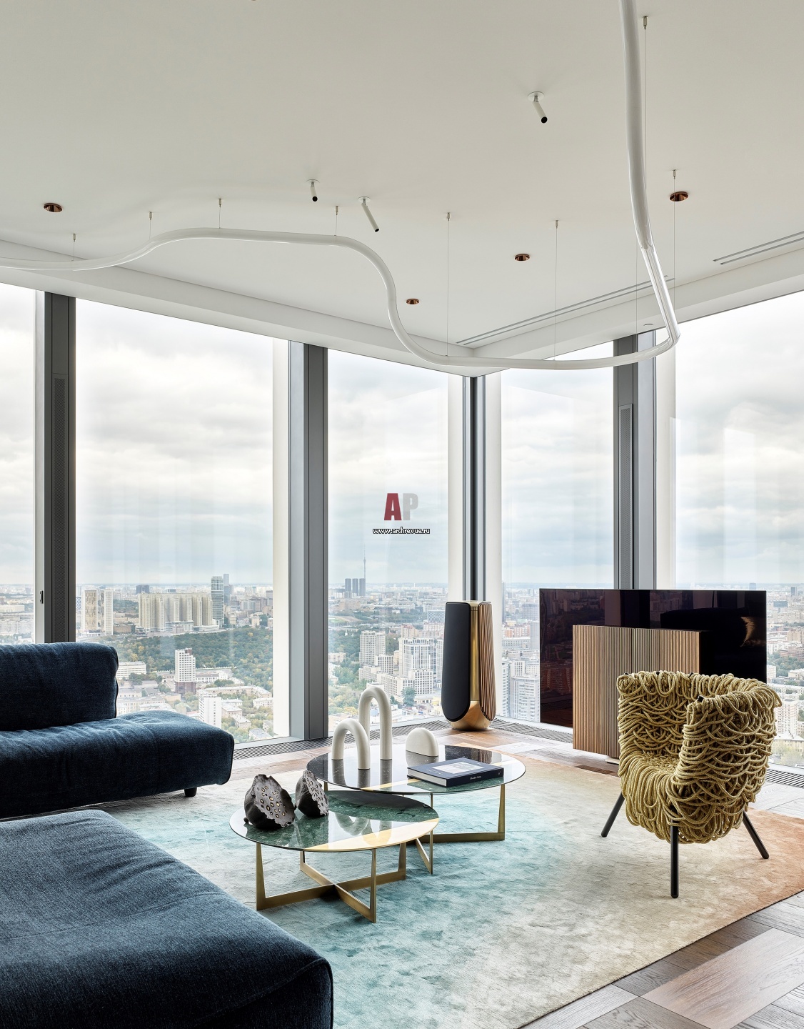Диванная группа расположена вблизи панорамных окон и «развернута» на видовую перспективу. Диван, Edra, модель Grande Soffice. Столики, Alex Mint. Кресло, Edra, модель Vermelha. Телевизор и акустика, Bang & Olufsen.