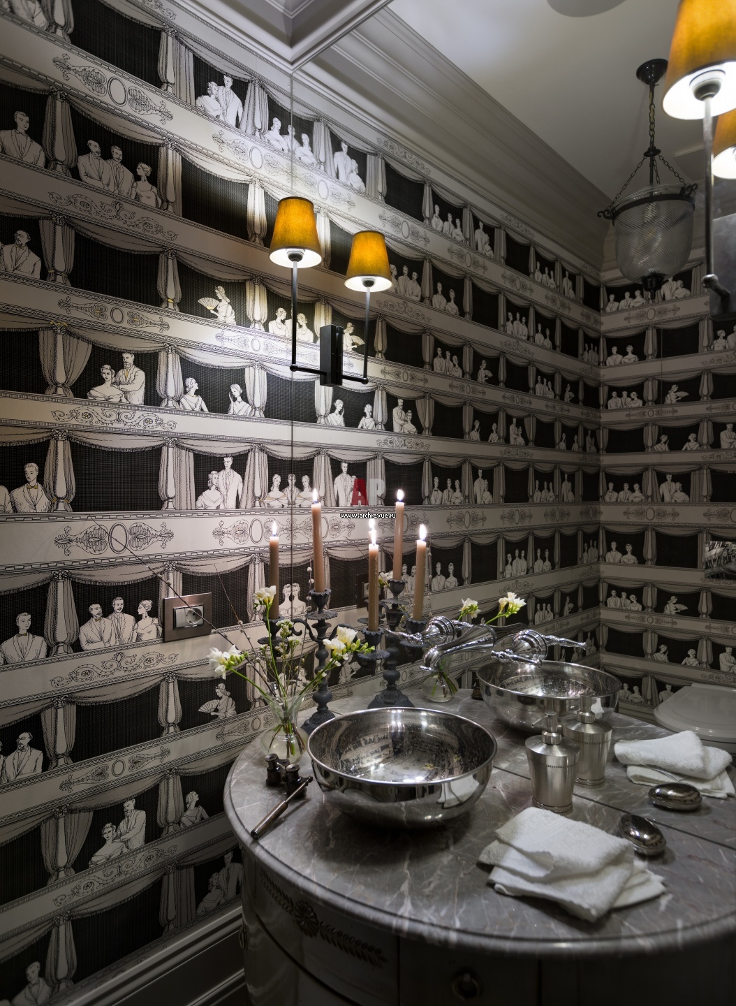 Фото интерьера гостевого санузла. На стенах – черно-белые обои, Osborne&Little. Полукруглая столешница умывальника из серого мрамора, раковина – из хромированного металла.