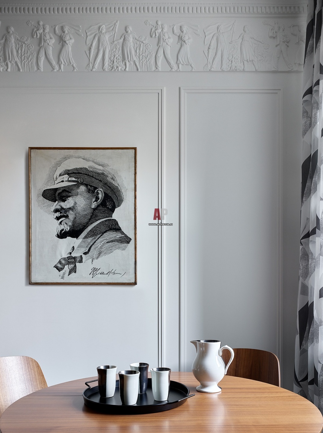 Квартира с элементами сталинского ампира. Кухню украшает барельеф – копия барельефа дома на Проспекте Мира, 106 «Рабочий и колхозники».