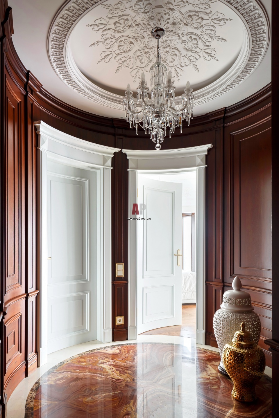 Оформление холла подчеркивает архитектуру квартиру с радиусными стенами. На потолке в поддержку радиусным стенам были спроектированы два купола с ажурным лепным орнаментом и светодиодной подсветкой. Двери и обрамления проемов сделали белого цвета на контрасте с темными панелями из ореха.