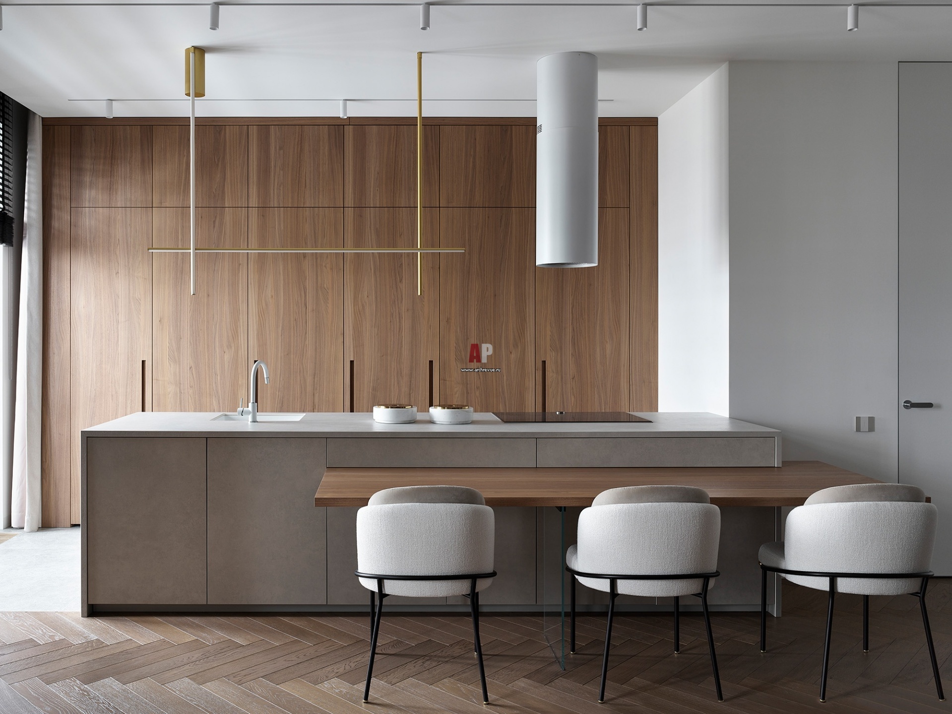 Кухня состоит из большого керамического острова с местом для завтраков на четырех человек и рабочей зоны, которая скрывается за раздвижной системой Rientrante. Закрытые фасады позволяют скрыть визуальный шум в виде мелкой бытовой техники, посуды, специй. Остров примыкает к небольшой кладовке, где находит дополнительный большой холодильник с морозильной камерой, винный шкаф и места для хранения.