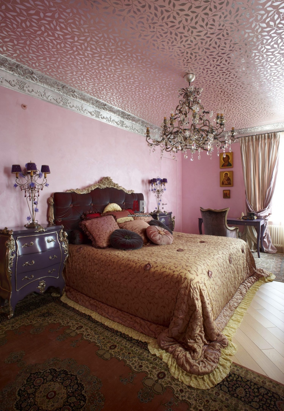 Интерьер классической спальни выполнен в теплых золотых, розовых и лиловых цветах. Стены покрыты декоративными финишами, потолок украшен трафаретной росписью с растительным орнаментом. Люстра, Mechini. Кровать, кресло, Provasi. Прикроватные столики, туалетный столик, комод, Luciano Zonta.