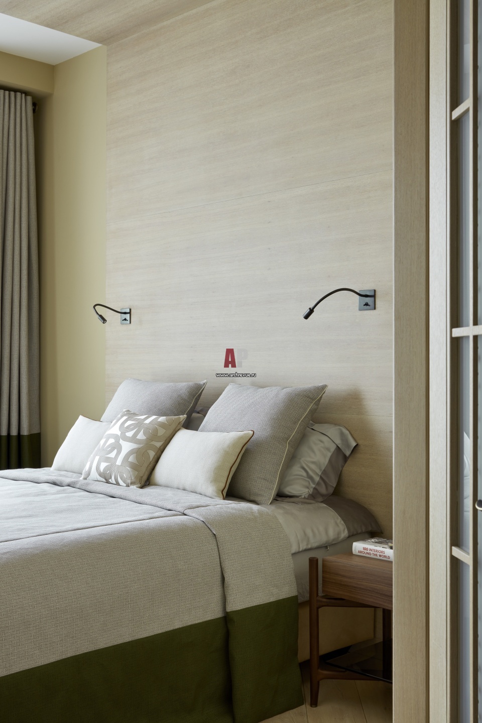 Интерьер спальни. Панель за изголовьем кровати, дуб под маслом. Прикроватная тумбочка, Porada. Светильники, Porta Romana.
