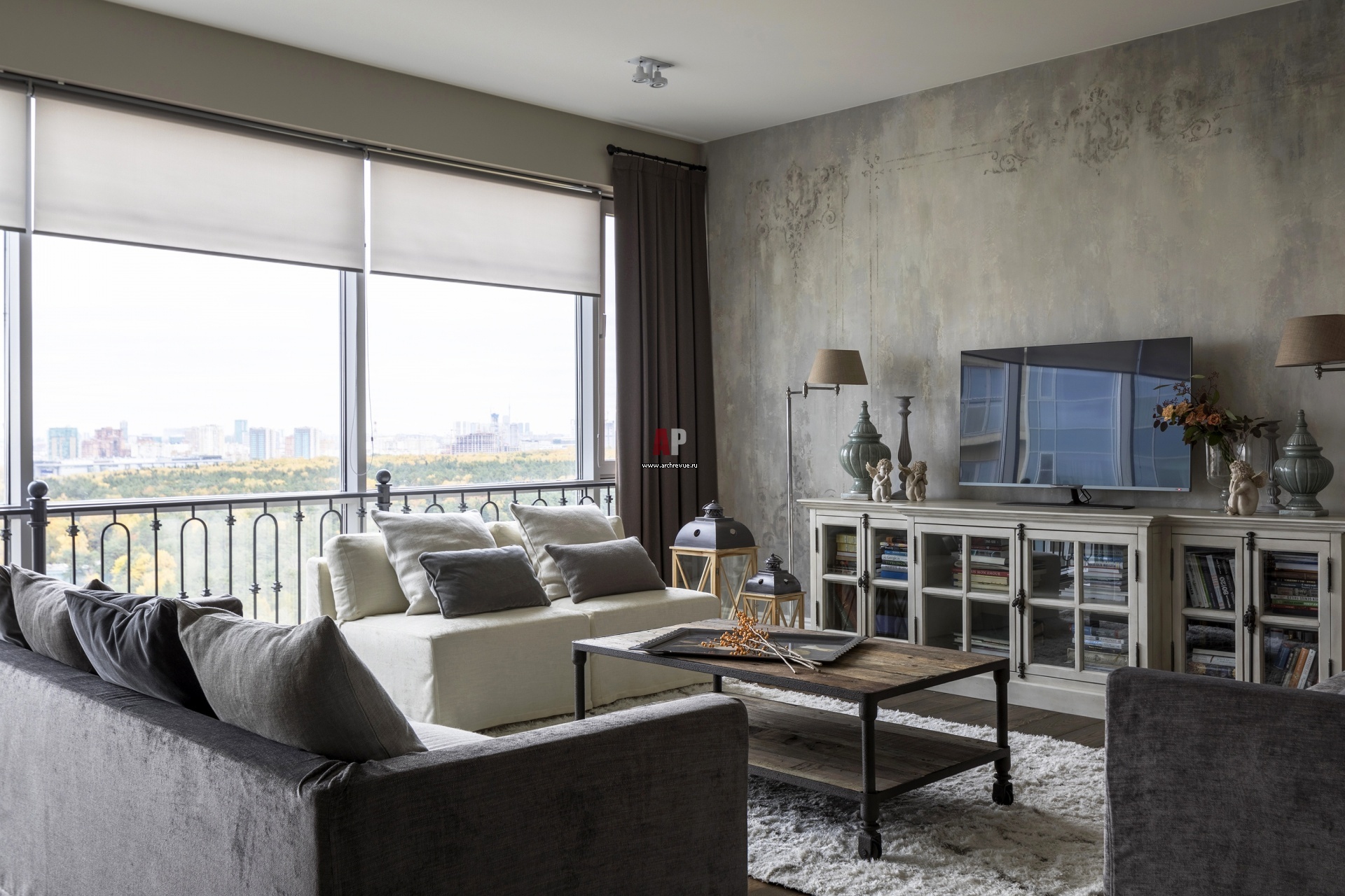 Основной декоративный акцент интерьера – художественная роспись, которая дает ощущение состаренной со временем поверхности с потертостями и живописными подтеками, какие можно увидеть лишь в старинных заброшенных особняках. Роспись, художник Мария Вейде. Журнальный стол и комод, Restoration Hardware.