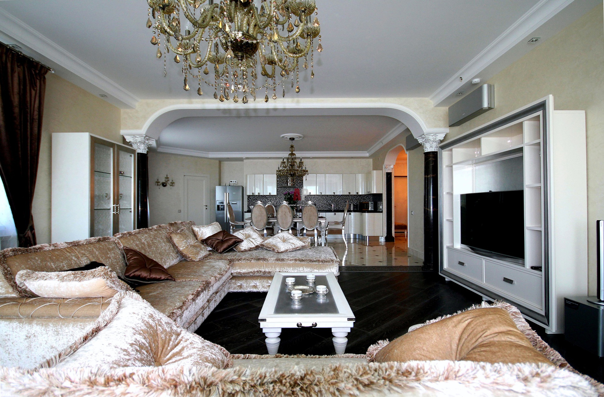 Гостиная объединена с кухней-столовой. Пространство зонировано с помощью стилизованных античных черных колонн с лепными пилястрами. Изделия из гипса выполнены по эскизам дизайнеров и покрыты серебром.