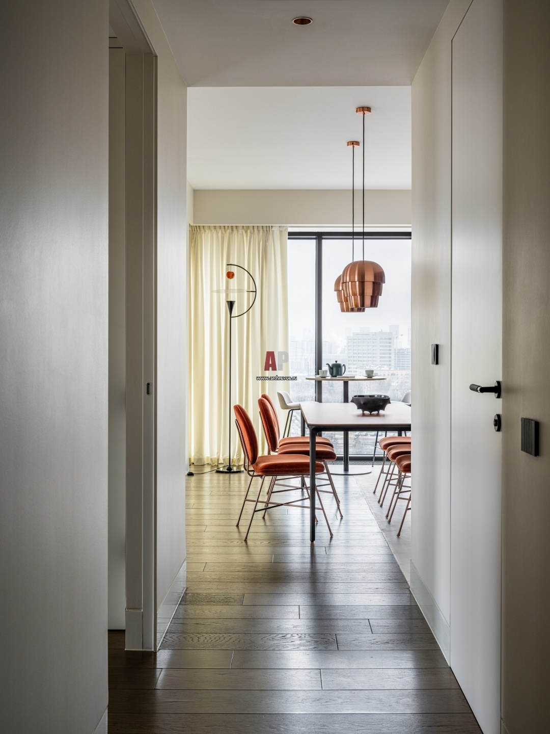 Вид из прихожей на кухню. Идея проекта – современная нейтральная база, дополненная яркими акцентами, неожиданными декоративными элементами и искусством.