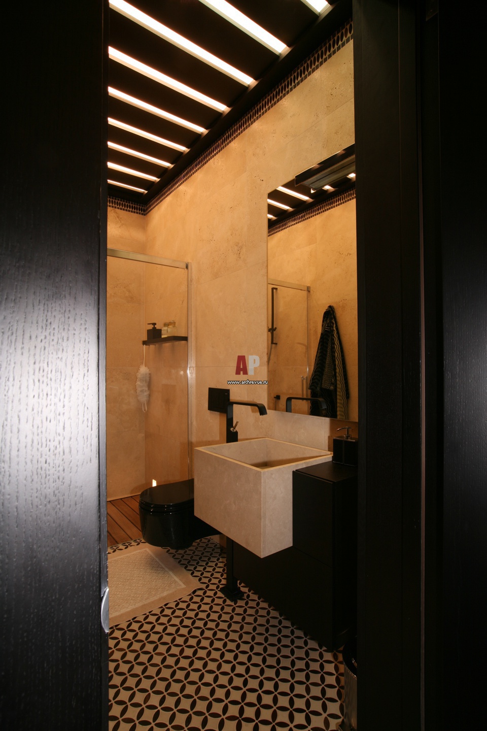 Интерьер мужского санузла отличают строгие, брутальные формы, деревянный декор потолка, авторский дизайн, компания Mobile Line Décor и мозаичное шахматное панно на полу, поставщик компания RIM.ru
