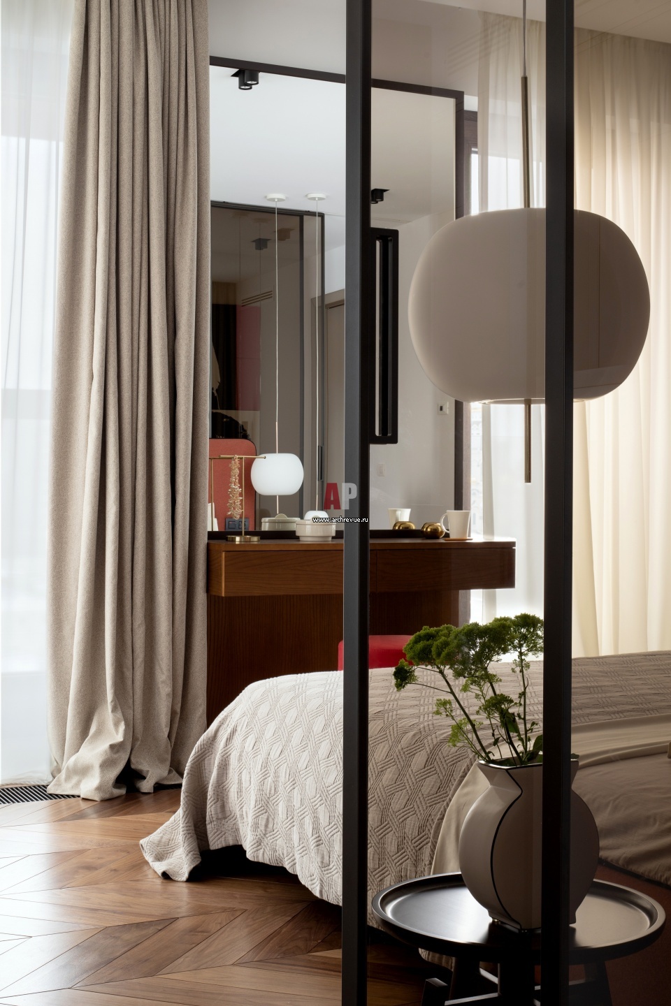 Дизайнеры объединили спальню и гардеробную, чтобы сделать одно общее помещение, зонированное дымчатыми прозрачными перегородками Rimadesio. Бонусом такого решения стало уменьшение тоннельного коридора и улучшение пропорций холла.