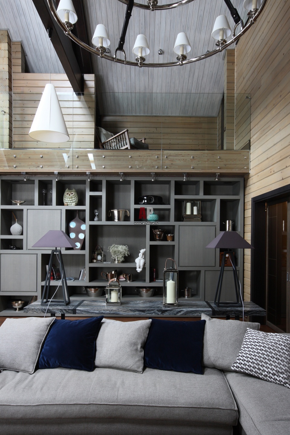 Интерьер двусветной гостиной с антресолью второго этажа. Серый стеллаж дизайнер заказала прямо на стенде бельгийской марки PH Collection во время выставки Maison & Objet.