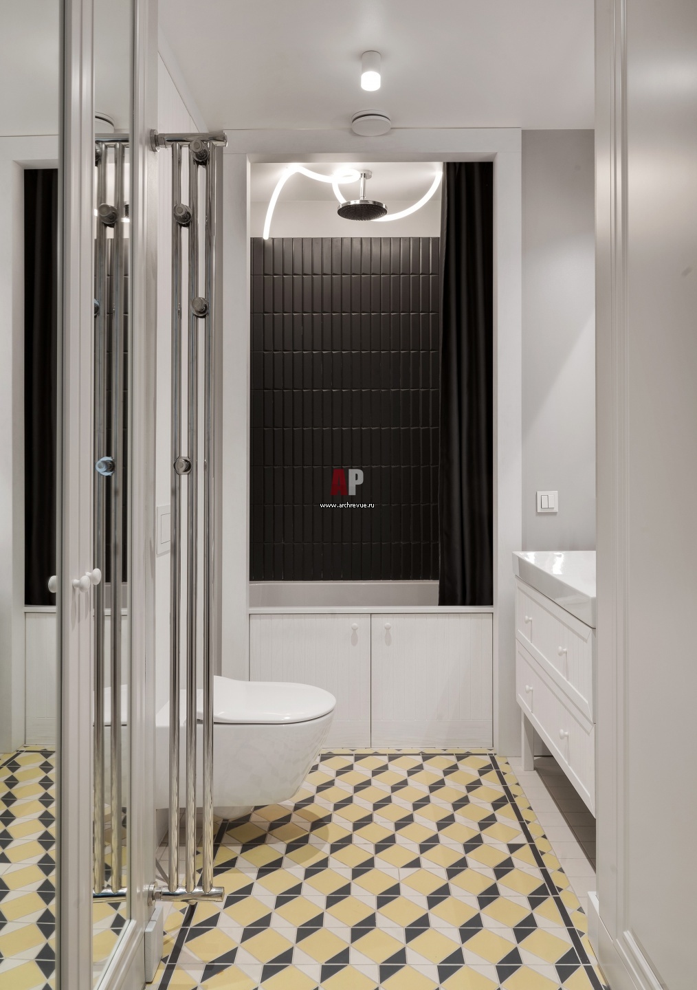 Санузел. Плитка, TopCer. Интерьер стоится на контрасте трех цветов: белого, черного и желтого.