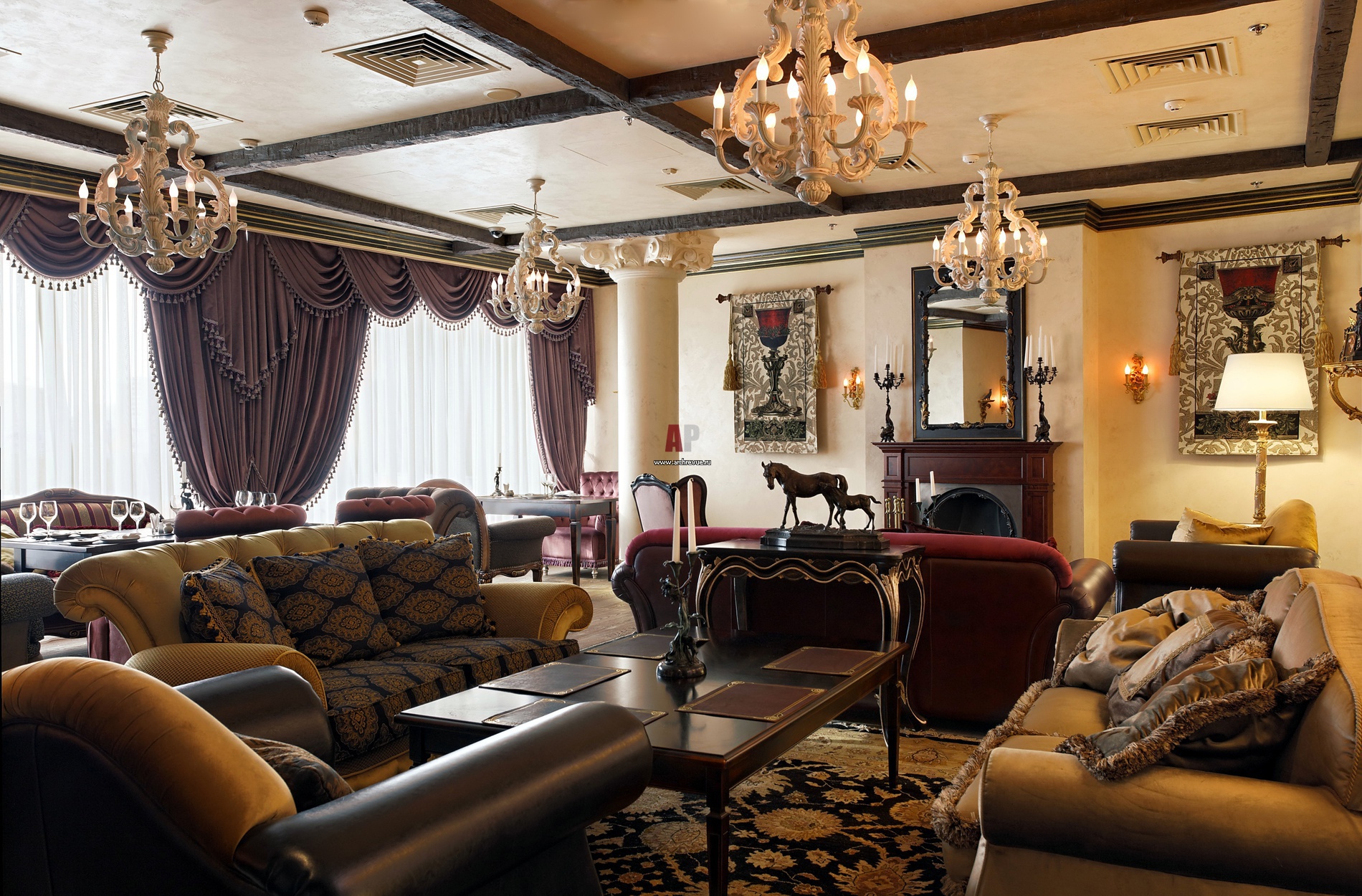 Атмосферу отдыха и релакса формируют пышные диваны, гобелены, подсвечники и бра, а также камин с порталом из красного дерева, поставщик «Интерьерный салон» («Арт-тон камины»).