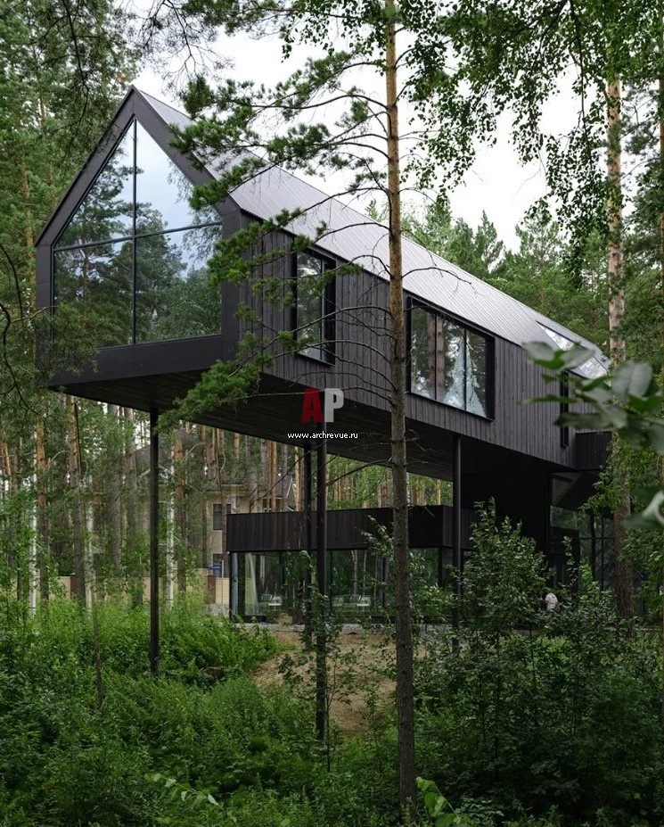 Дом с этажом на сваях. Фасад зашит черной, состаренной сосной.