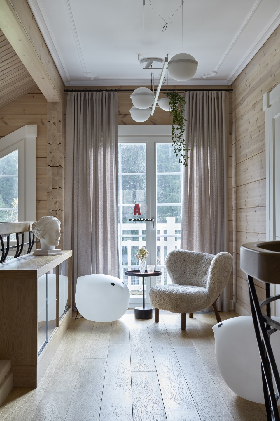 Зона отдыха в холле второго этажа. Кресло, &Tradition. Столик, Cassina. Пуфы Huelsta, модель Bird. Люстра, Artemide.