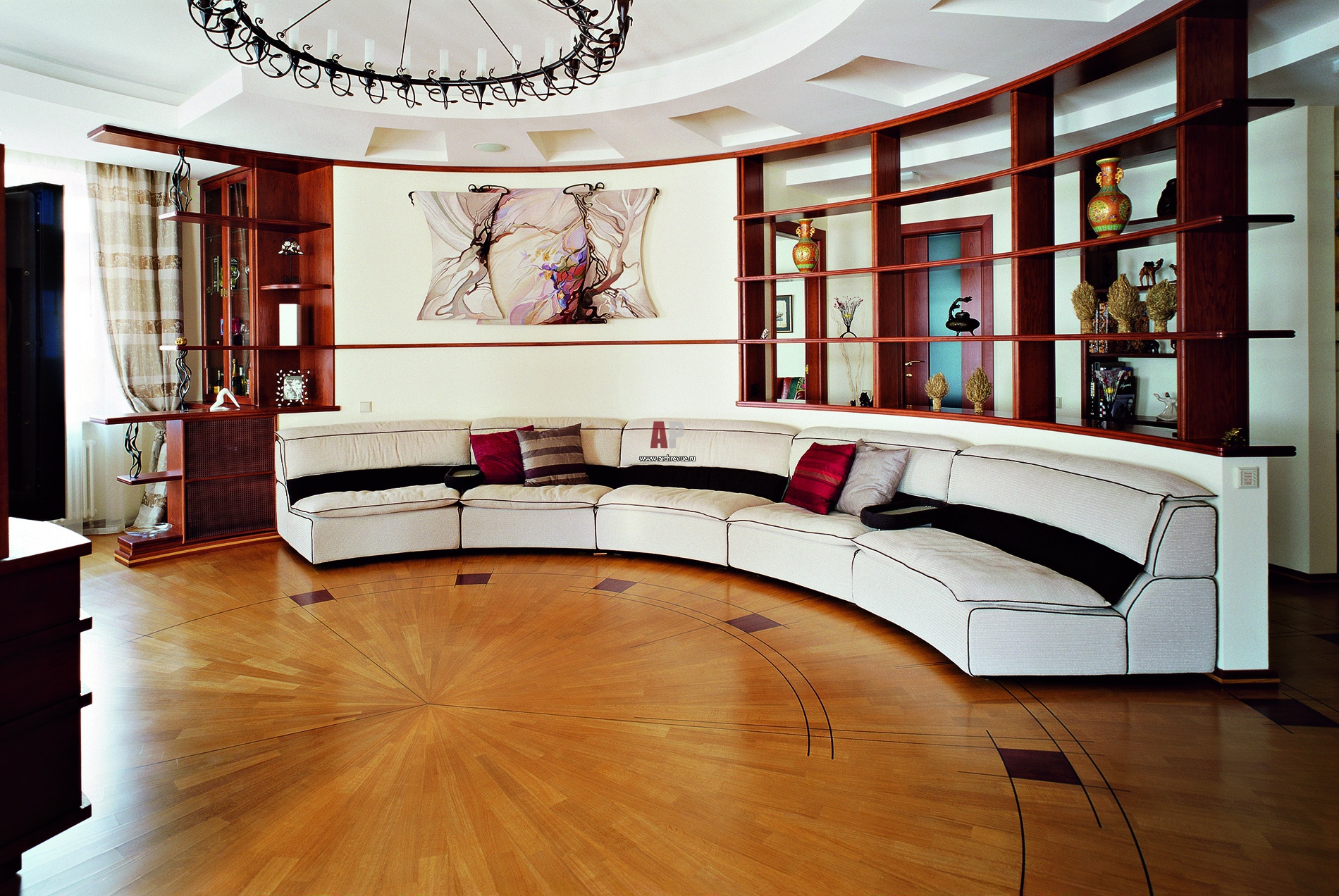 Паркет из древесины венге, дуба и мербау набран лучами. Этот прием еще более акцентирует круговую планировку квартиры. В рисунке паркета читаются отсылки к работам Ф. Райта.