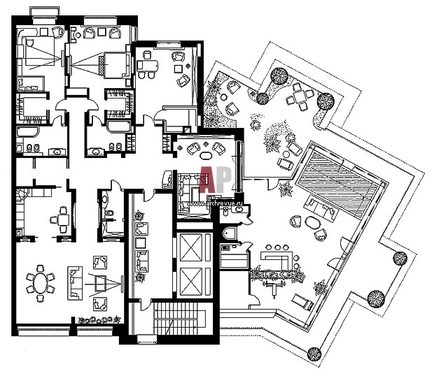 План большой квартиры в неоклассике с террасой на крыше.